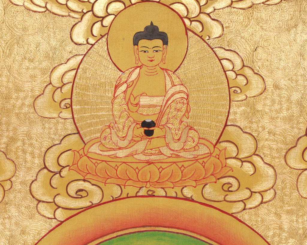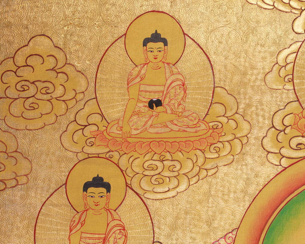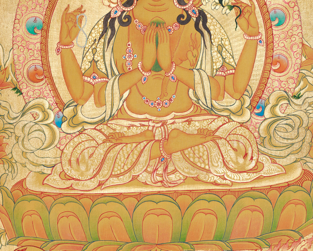 Bathed in radiant gold and divine serenity, this Chenrezig with Five Dhyani Buddha thangka beautifully captures the spirit of boundless compassion and enlightened wisdom. Painstakingly hand-painted in the traditional Nepali style, the artwork is rendered on cotton canvas with exquisite acrylic hues and highlighted with genuine 24K gold, giving the composition a sacred, luminous glow. The detailed brushwork and balanced color palette showcase the artist's deep devotion and skill, elevating the thangka into a revered spiritual icon and an enduring work.