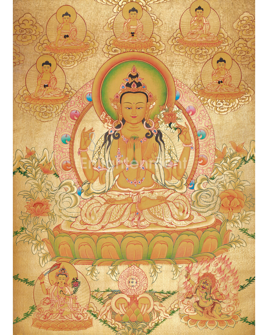 Four-Armed Chenrezig With Five Dhyani Buddhas | A Divine Assembly of Compassion and Enlightened Energy