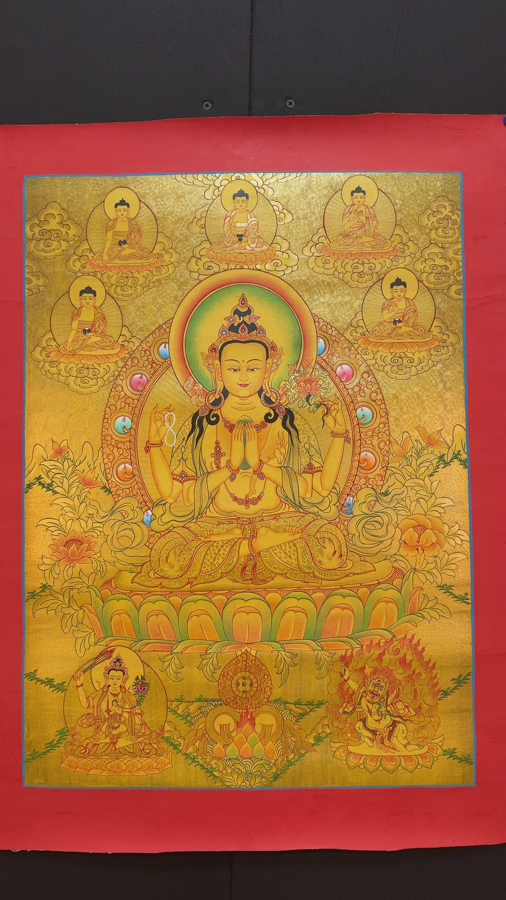 This thangka of Chenrezig with the Five Dhyani Buddhas is more than a sacred painting; it serves as a spiritual gateway that invites peace, protection, and compassionate energy into your surroundings.