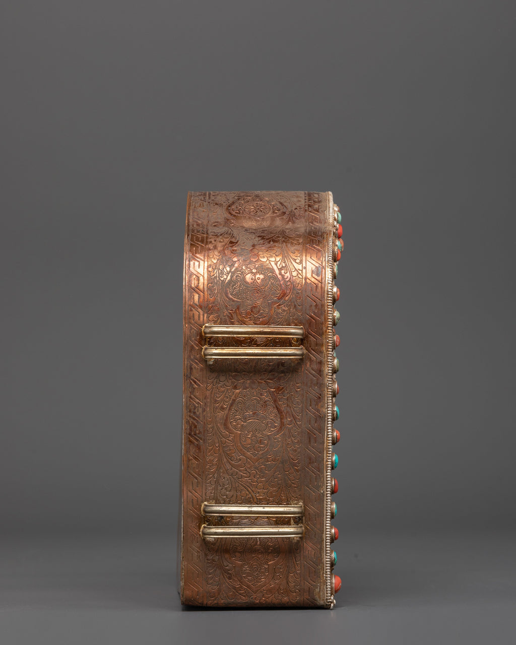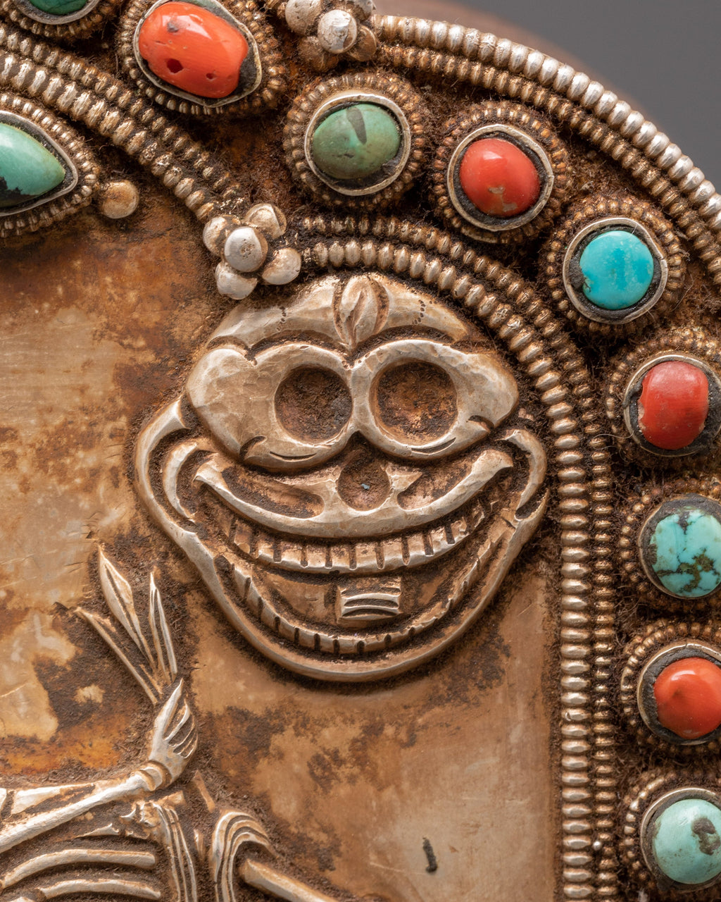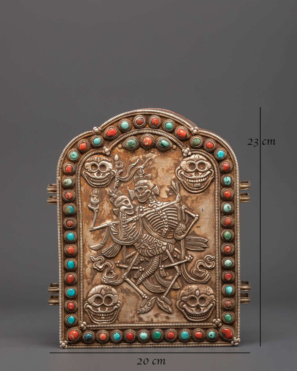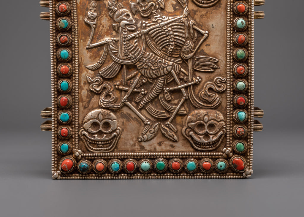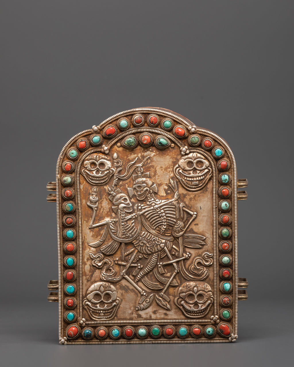 The Chitipati Ghau Box Amulet is a unique and magnificent piece of spiritual craftsmanship with deep symbolic value. This amulet, measuring 23cm in height and 20cm in width, is precisely constructed from 98% silver with a copper body, ensuring a beautiful finish. This amulet, embellished with imitation coral and turquoise stones, has an exquisite design that reflects the traditional Tibetan aesthetic. The Chitipati figure, which represents the 'Lord of the Dead' or 'the Dancing Lords of the Cemetery,' is carved into the box's surface, symbolizing divine supremacy over life, death, and transformational power.