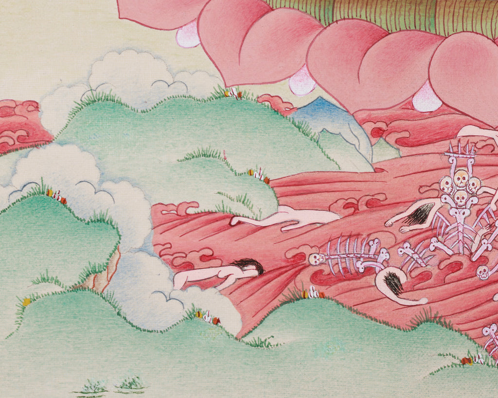 This thangka features the Chitipati—dancing skeleton deities—performing a graceful yet commanding dance symbolizing life and death. They are surrounded by a halo of glowing flames that signify the eradication of ignorance and attachment. Each deity is clutching ritual sticks and skull cups that embody transformation and ego-offering. Their skeletal appearance signifies freedom, reminding us of life's fleeting nature and that true liberation comes from acceptance and awareness. The lotus throne illustrates purity overcoming illusion, while the celestial backdrop of clouds and landscapes conveys a sense of sacred vastness and depth.