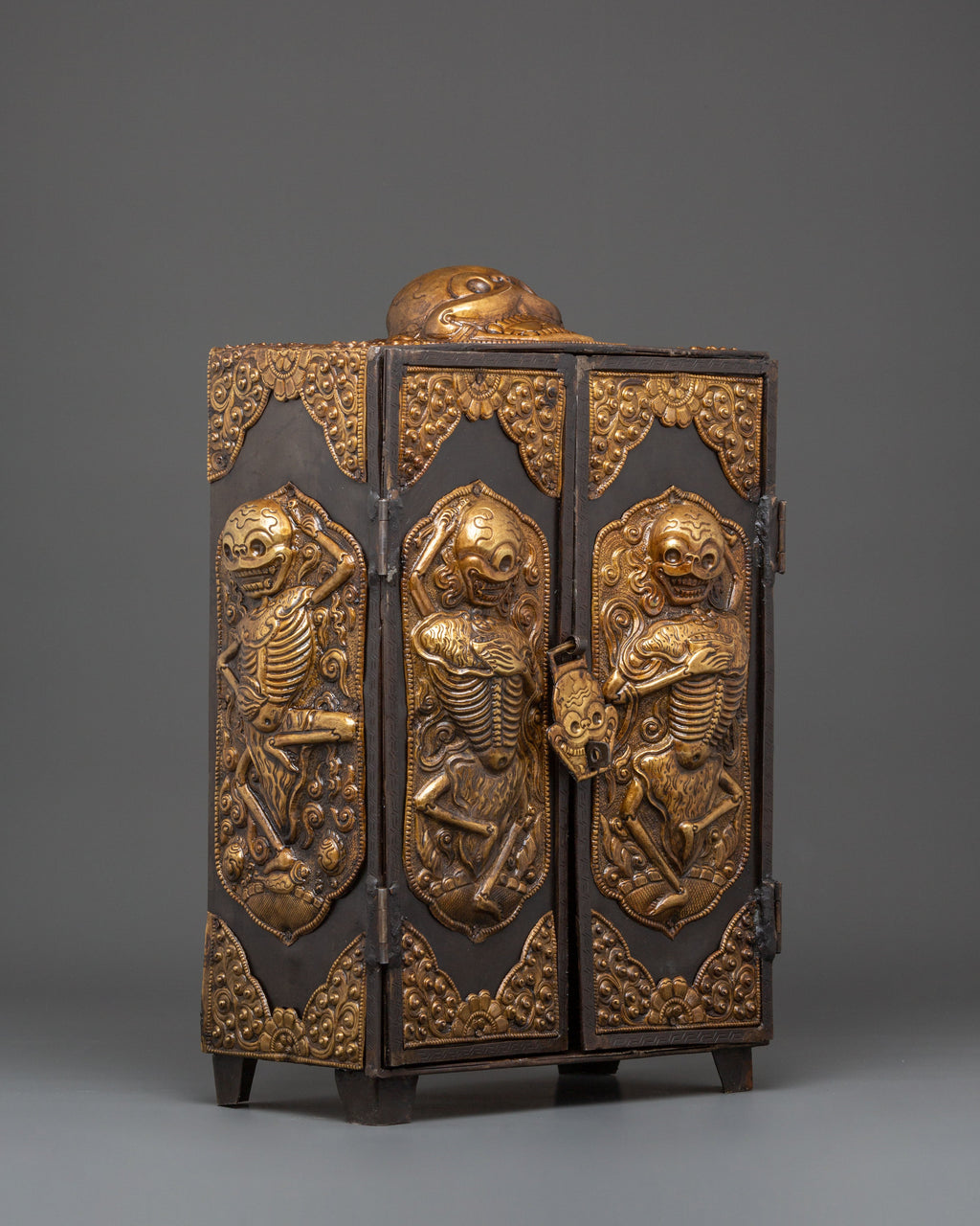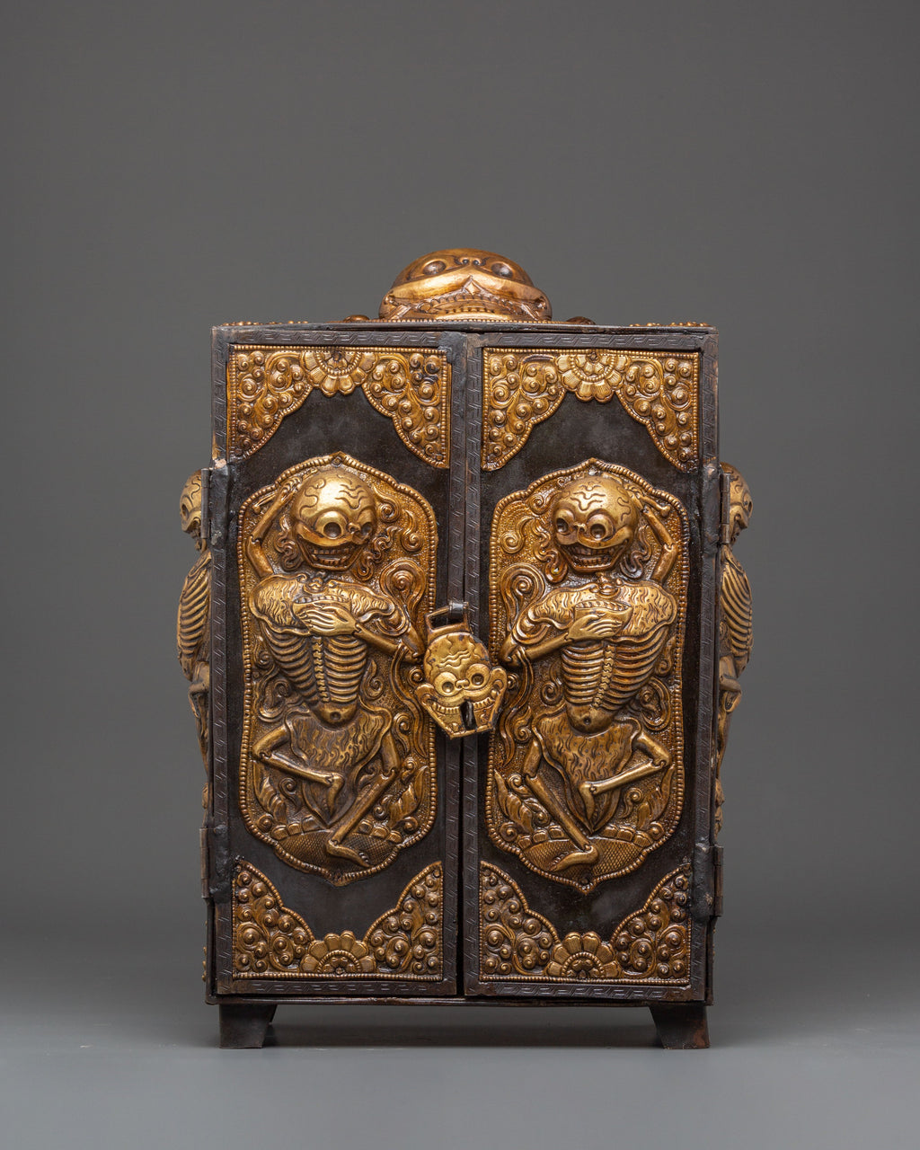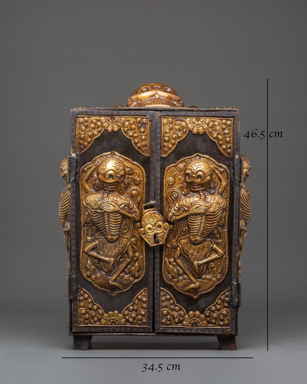 The box measures 46.5cm in height, 34.5cm in width, and 18.5cm in side width, weighing 5.90kg. Its intricate detailing of the Chitipiti skeleton figure carries profound spiritual significance, often used as a meditation aid to reflect on mortality and transcendence. Beyond its ritual importance, this iron and brass box showcases the dedication of Tibetan artisans who create sacred objects with deep cultural and spiritual resonance. It serves as both a practical ritual storage chest and a symbolic artifact that enriches Buddhist