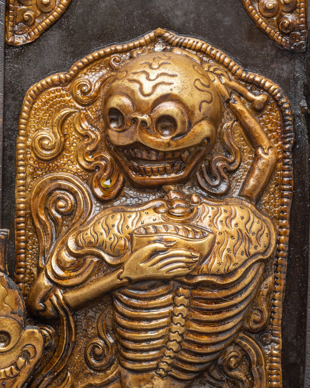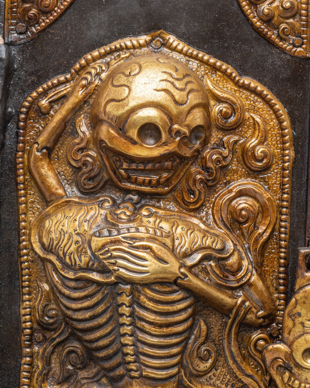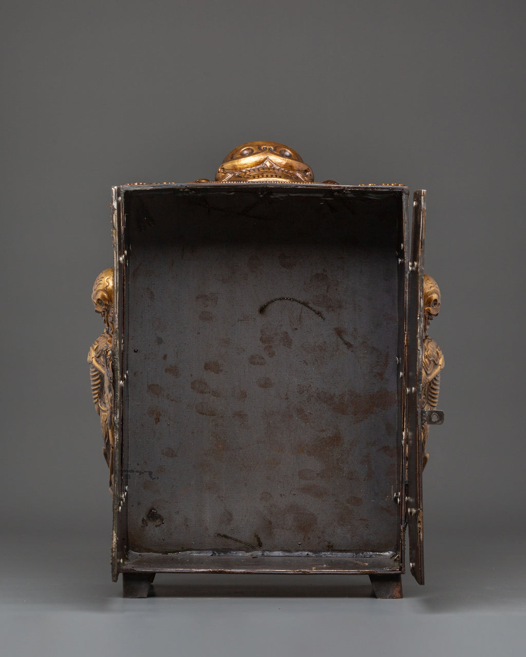 The box measures 46.5cm in height, 34.5cm in width, and 18.5cm in side width, weighing 5.90kg. Its intricate detailing of the Chitipiti skeleton figure carries profound spiritual significance, often used as a meditation aid to reflect on mortality and transcendence. Beyond its ritual importance, this iron and brass box showcases the dedication of Tibetan artisans who create sacred objects with deep cultural and spiritual resonance. It serves as both a practical ritual storage chest and a symbolic artifact that enriches Buddhist