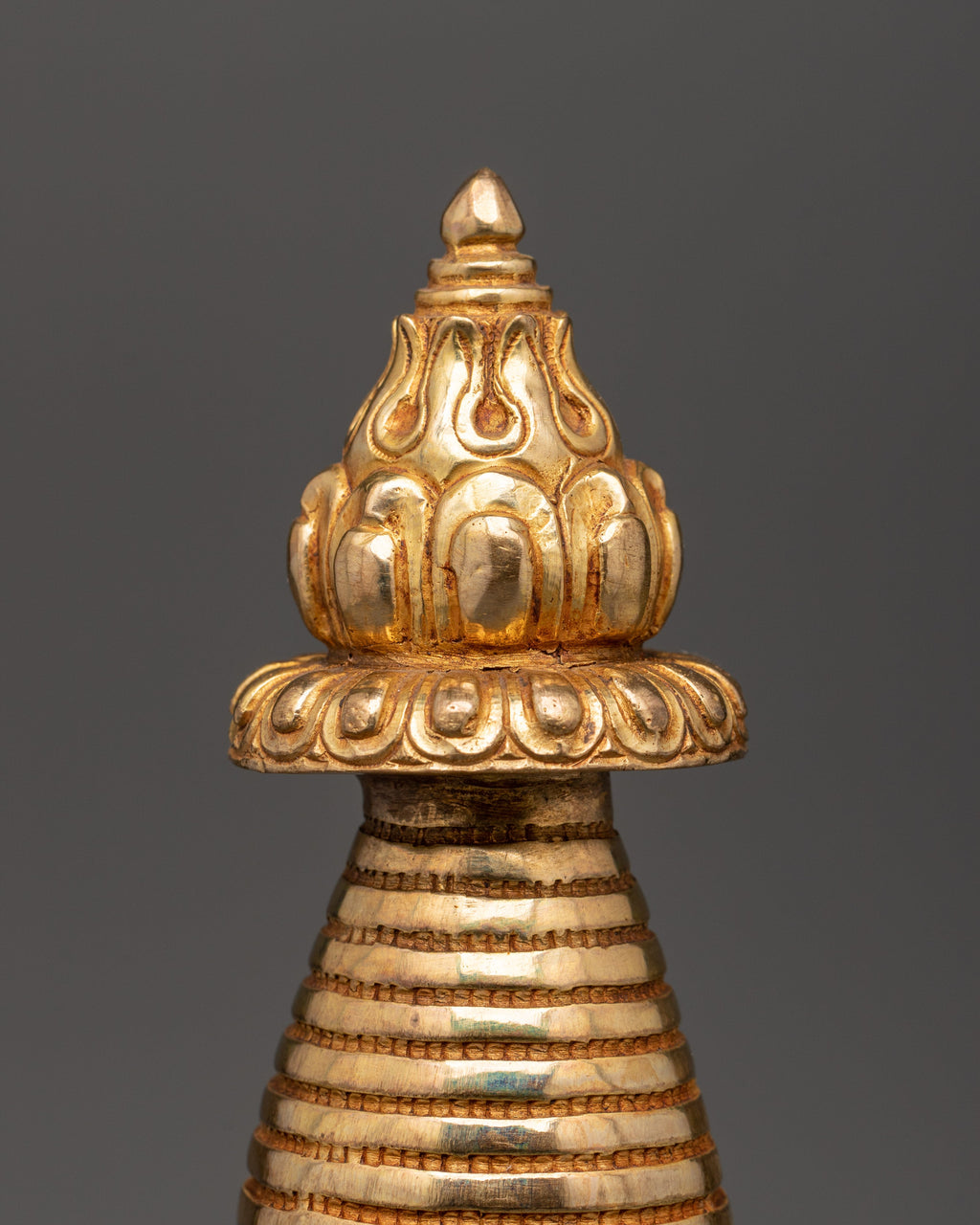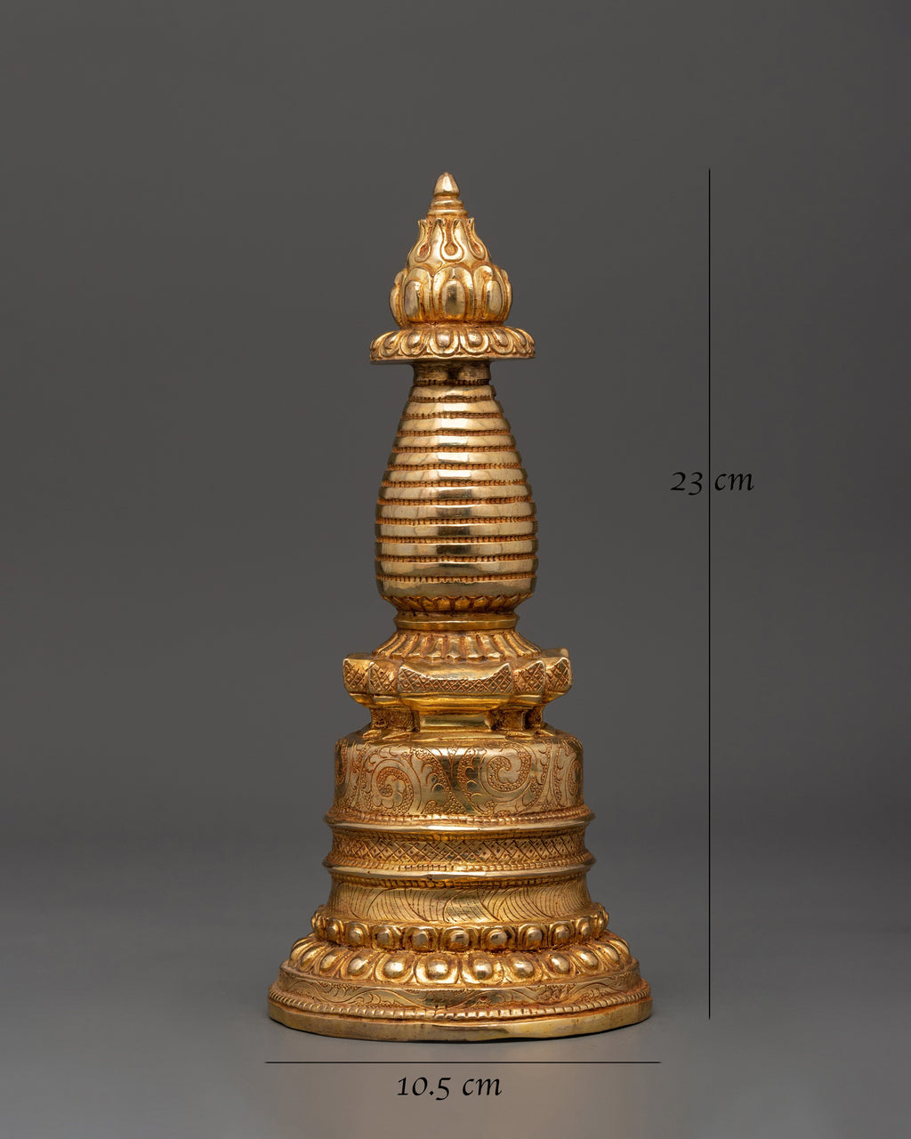 The Gold-Plated Copper Chorten is a sacred Tibetan stupa used for altars, rituals, and spiritual blessings. Standing 23cm tall, 10.5cm broad, and weighing 0.91kg, this Chorten is made of copper and lavishly plated in gold, symbolizes purity, knowledge, and spiritual illumination. Its delicate design and balanced proportions make it an appropriate centerpiece for a home shrine or temple altar.