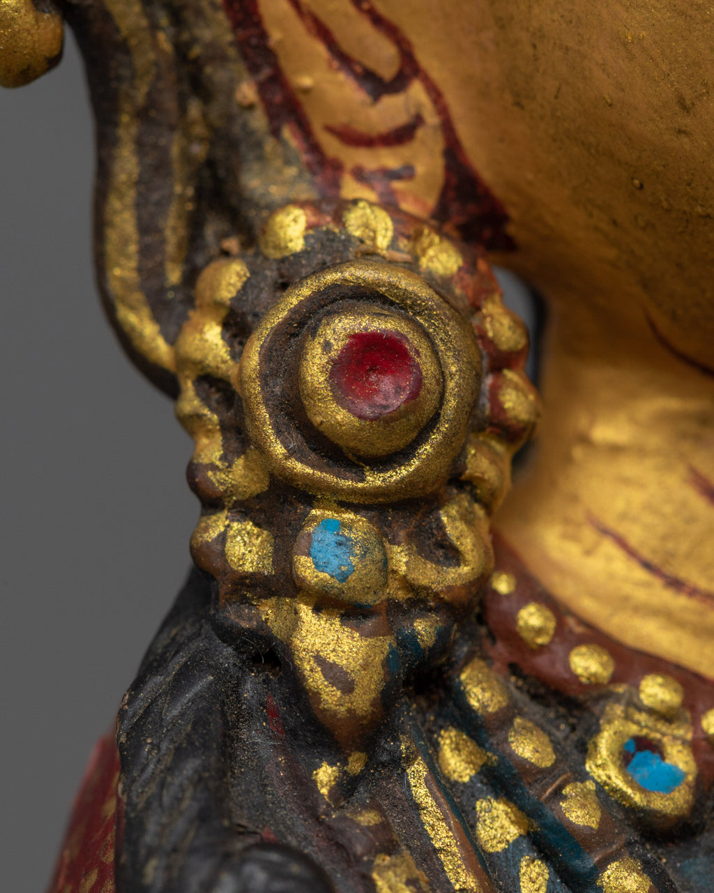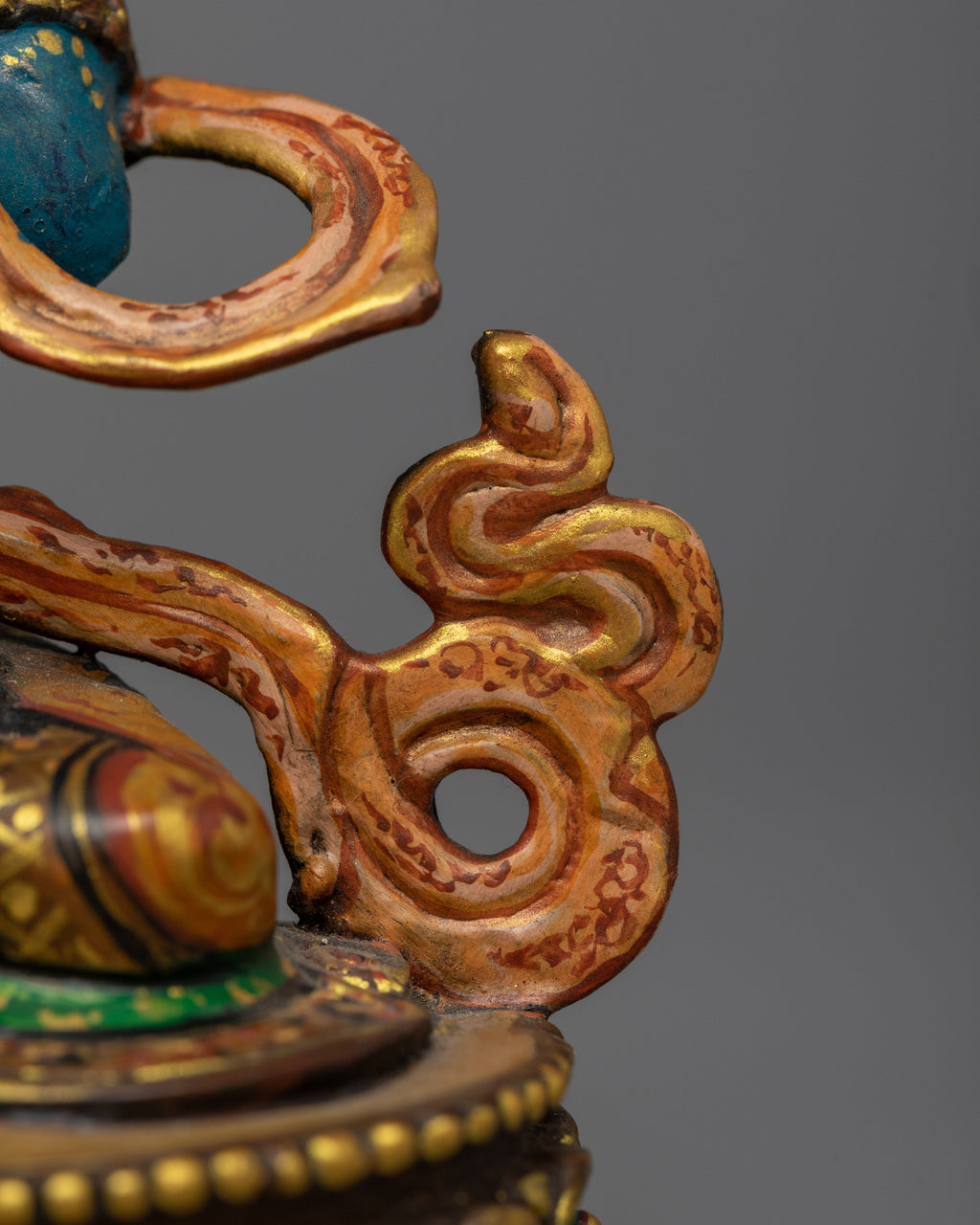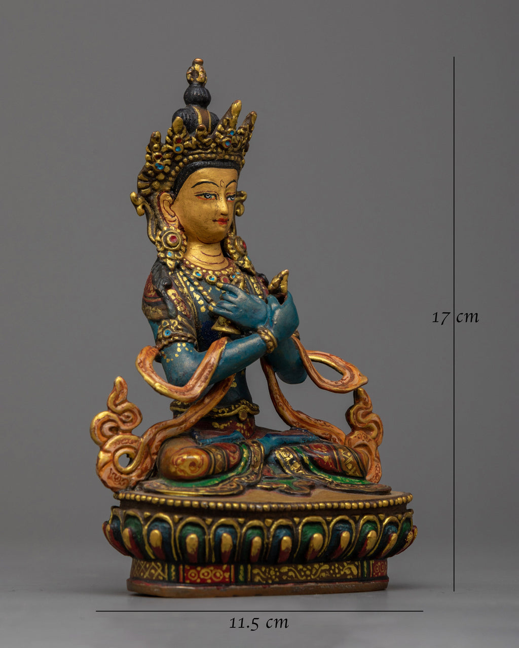 The colored Vajradhara statue is shown here in a compact form, Rising 6.7 inches tall and 4.5 inches at the base, exuding a grand aura of wisdom and spiritual strength. The brilliant colors and detailed features of this statue, which is embellished with 24K gold gilding and gold acrylic paintings, catch the eye and elevate the spirits. The antique finish conveys authenticity and devotion, signifying Vajradhara's ageless knowledge.