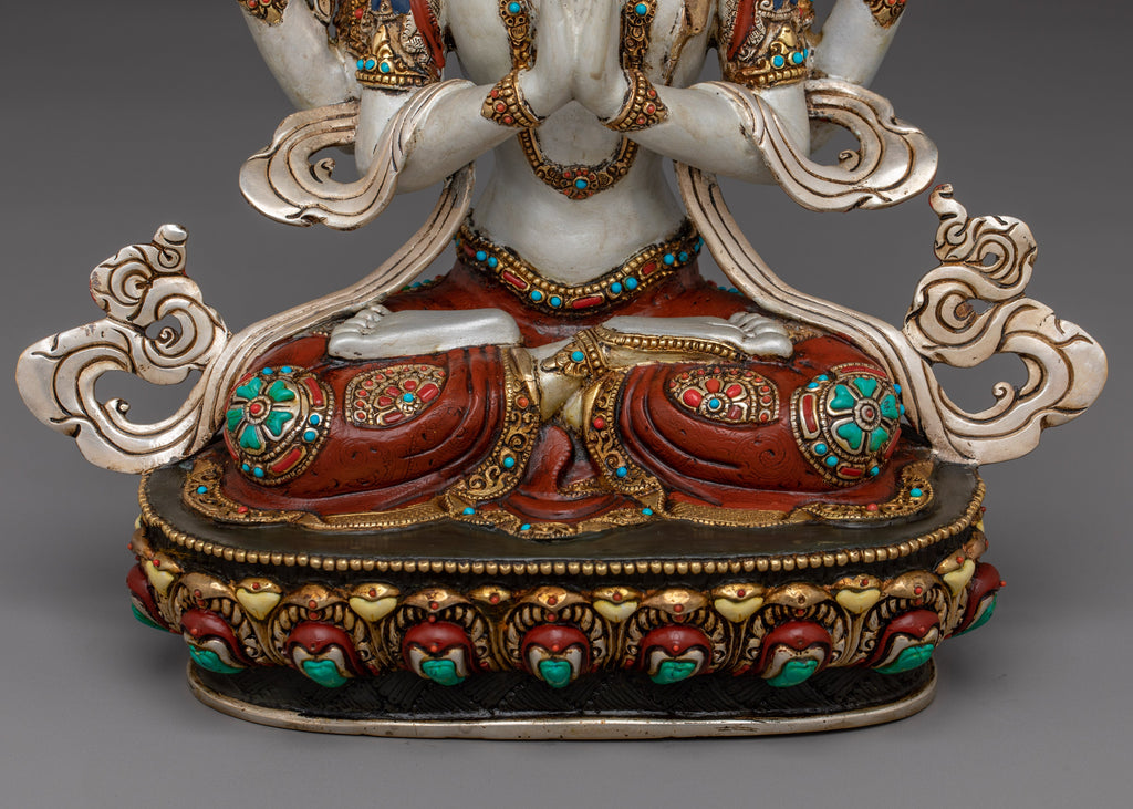 Chenrezig (Avalokiteshvara), the embodiment of boundless compassion, is depicted with four arms, each expressing a facet of his enlightened intent. In his upper right hand, he holds a crystal mala, symbolizing the continuity of saṃsāra and the liberating power of mantra recitation. A blooming lotus rests in his upper left hand, representing purity and spiritual awakening beyond suffering. His main hands are joined at his heart in Anjali Mudra (añjali mudrā), reflecting the union of wisdom (prajñā) and compassion (upāya). Seated in vajrāsana, he exudes calm presence and unwavering resolve. An ushnisha (uśṇīṣa) crowns his head, topped by Amitabha Buddha, symbol of infinite light and compassion. Adorned with the Five Dhyani Buddhas and a deer skin draped over his shoulders, Chenrezig radiates peace, non-violence (ahimsa), and the noble essence of enlightenment.