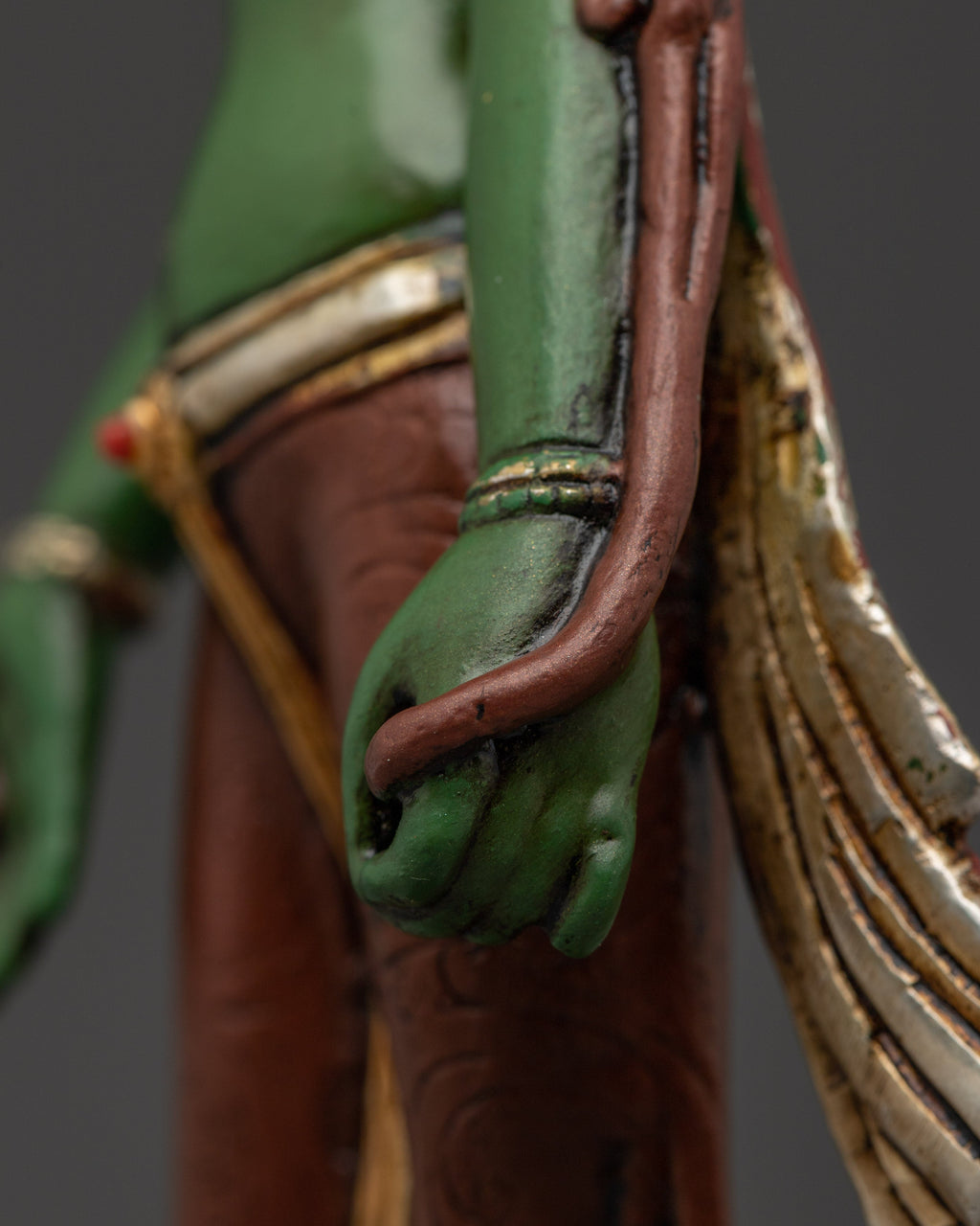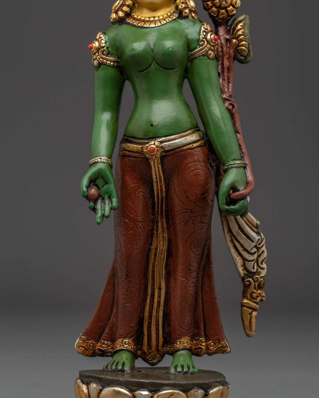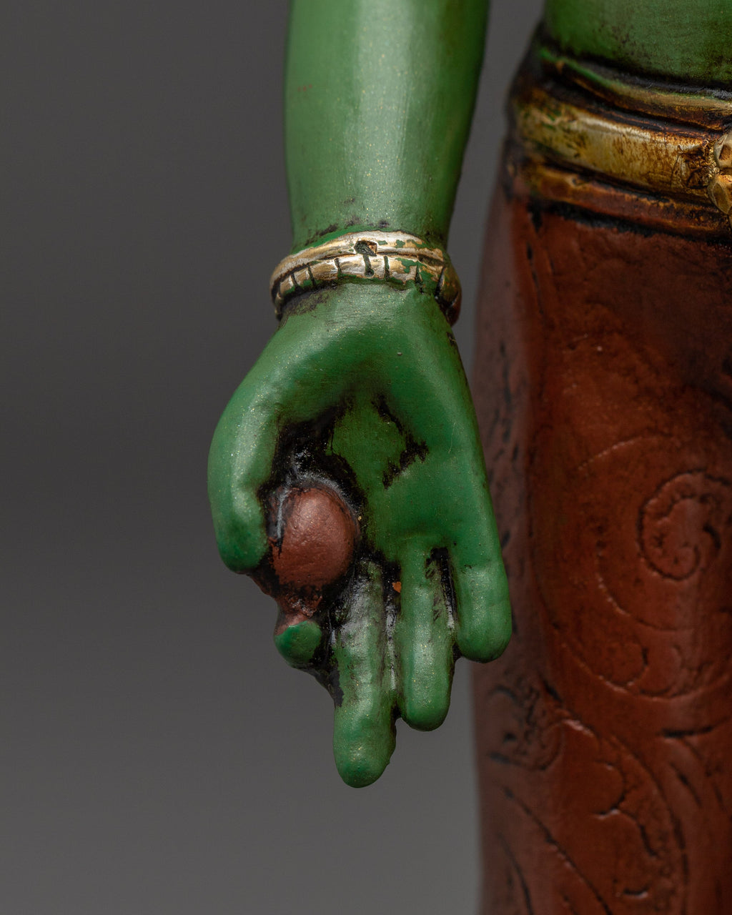 As depicted, Green Tara is shown standing on a lotus throne, signifying her active compassion and willingness to help. Her hands express profound meaning through their gestures; the right hand is displayed in the om Mudra, symbolizing her boundless generosity and willingness to provide blessings. Meanwhile, her left hand delicately holds a blue lotus (Utpala), a symbol of purity and spiritual awakening, offering protection and reassurance to those who seek her guidance.