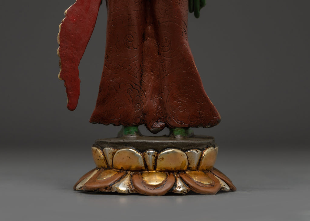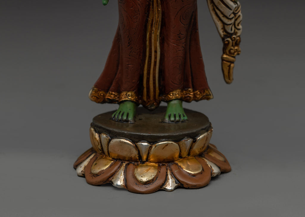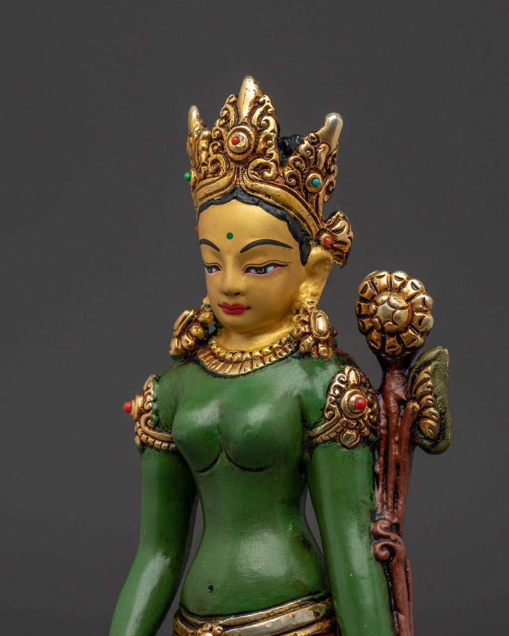 As depicted, Green Tara is shown standing on a lotus throne, signifying her active compassion and willingness to help. Her hands express profound meaning through their gestures; the right hand is displayed in the om Mudra, symbolizing her boundless generosity and willingness to provide blessings. Meanwhile, her left hand delicately holds a blue lotus (Utpala), a symbol of purity and spiritual awakening, offering protection and reassurance to those who seek her guidance.