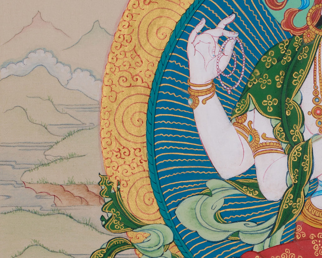 Chenrezig, or Avalokiteshvara, the Bodhisattva of Compassion, is the embodiment of boundless love and mercy in Tibetan Buddhism. Known for his vow to alleviate the suffering of all beings, Chenrezig is depicted with four arms. In this thangka, he is shown seated on a lotus throne, with his four-armed form; his two main hands are joined at his heart, holding a wish-fulfilling jewel that symbolizes infinite love and wisdom. His other hands hold a lotus flower and a crystal rosary, signifying purity and endless compassion. The serene background of clouds, flowers, and soft greenery reflects his nurturing energy. At the same time, the use of 24K gold further highlights his divine radiance, creating a powerful and uplifting presence in your sacred space.