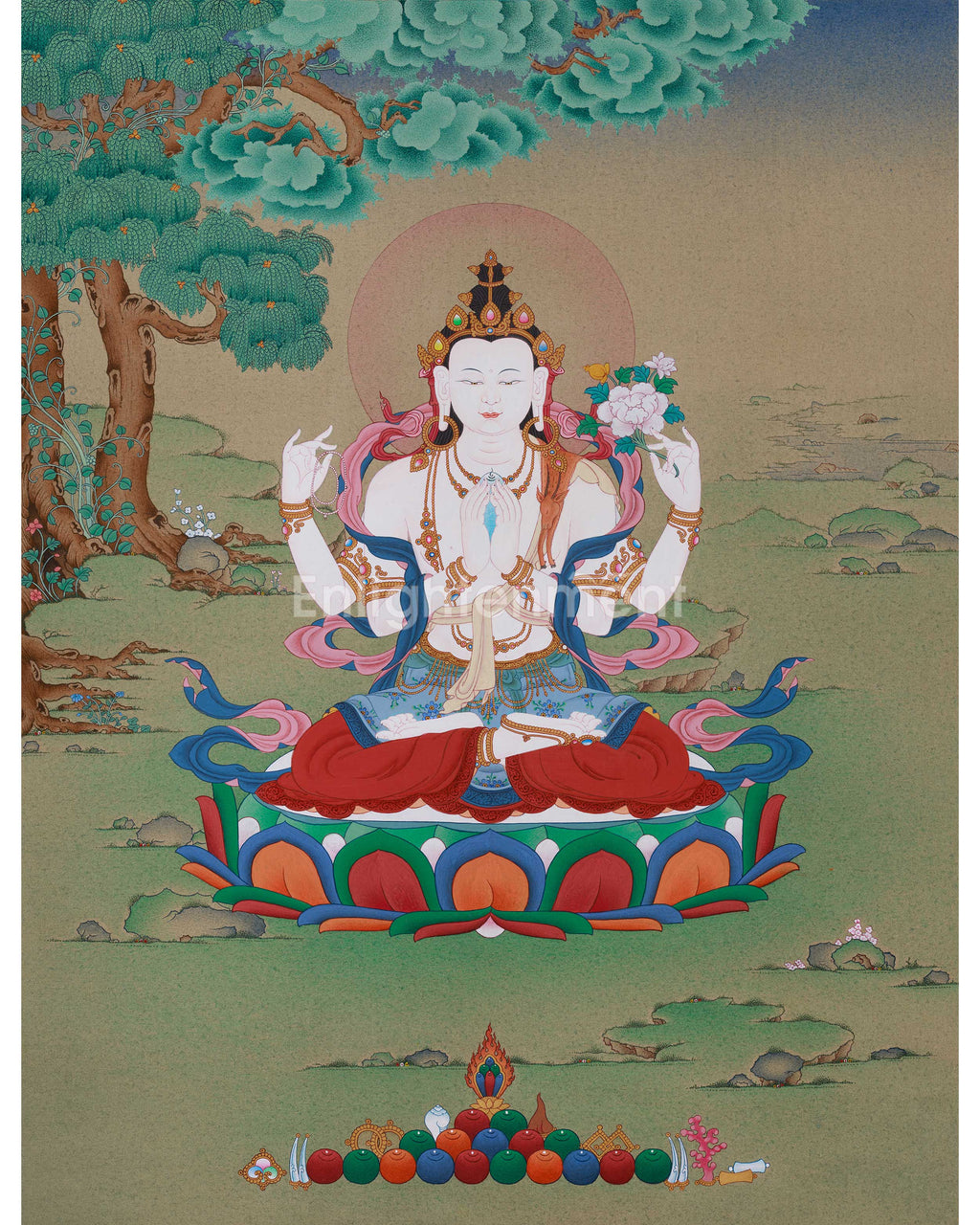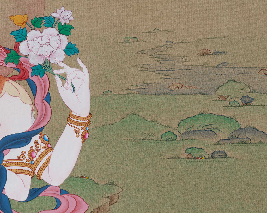 This hand-painted thangka beautifully portrays the Compassion Deity, Chenrezig, using natural stone colors and genuine 24K gold on fine cotton canvas. Created in the traditional Karma Gadri style, it embodies the grace, openness, and meditative clarity typical of traditional Himalayan Buddhist art. The painting features a spacious composition, realistic landscapes, and delicate figures. The soft greens of the background, serene sky, and detailed floral elements are hallmarks of this style, inspiring a sense of peaceful reflection and devotion.