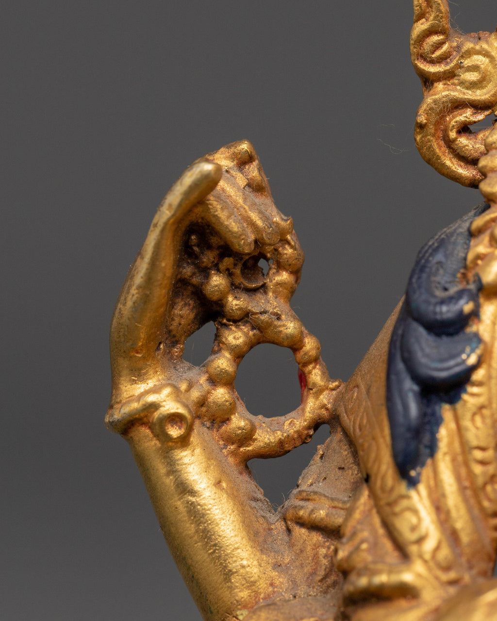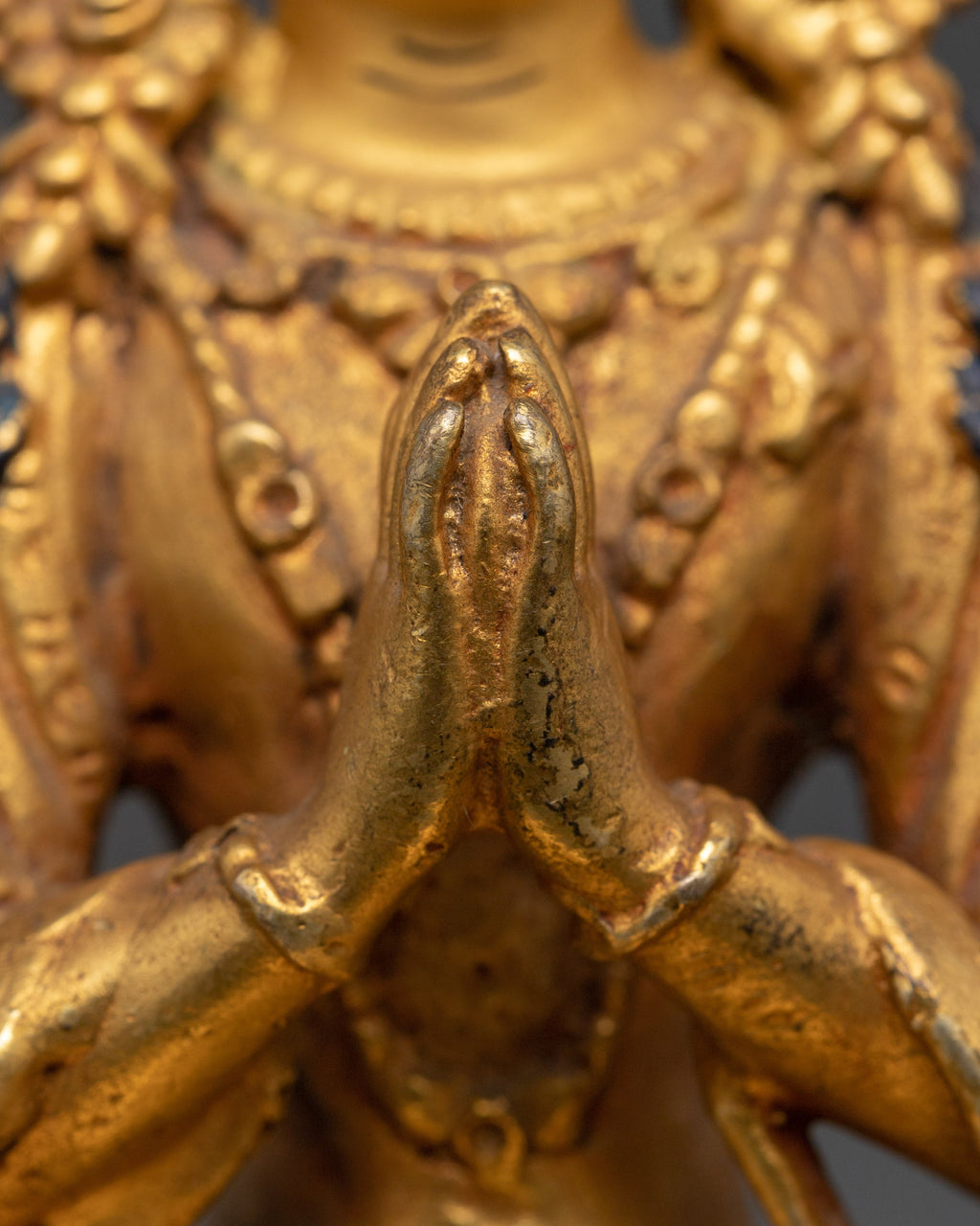 Crafted meticulously from copper and finished with elegant gold plating, this Four-Armed Chenrezig Bodhisattva statue a divine and peaceful energy. Revered in Mahayana Buddhism as the embodiment of compassion, Chenrezig’s four arms represent his infinite loving-kindness reaching out to all beings. Every detail—from his serene facial expression to the lotus flower, prayer beads, and wish-fulfilling jewel—is rendered with exceptional artistry, making this statue a powerful symbol of spiritual grace. More than a decorative piece, it serves as a meaningful focal point for meditation, spiritual reflection, or as a cherished addition to any sacred space, inviting compassion and tranquility into your daily life.