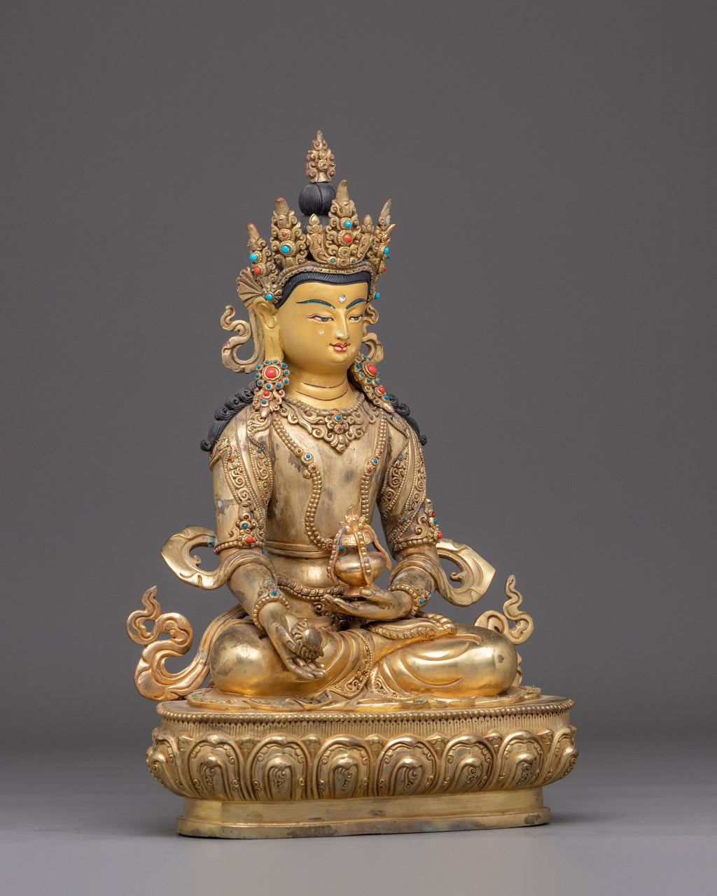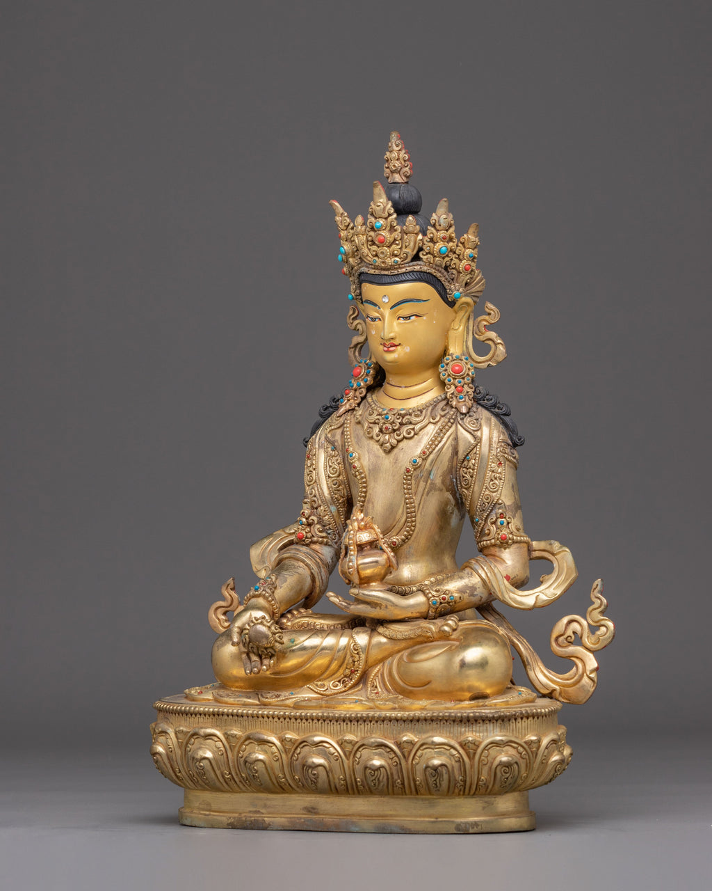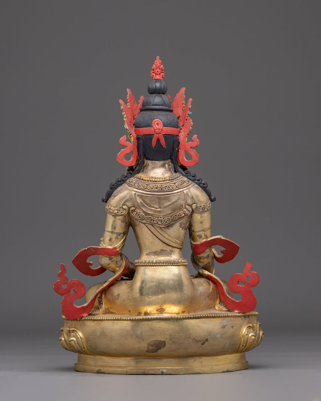 Akasagarbha, which means "Essence of Space" in Buddhist teachings, represents limitless understanding, compassion, and clarity. He is said to eliminate ignorance and guide beings to enlightenment, representing the vast expanse of knowledge. This handcrafted statue shows Akasagarbha sitting in tranquil meditation, his calm expression representing inner serenity and spiritual illumination. Copper and gold symbolize equilibrium between the material and heavenly realms, while turquoise and coral represent healing, strength, and protection.