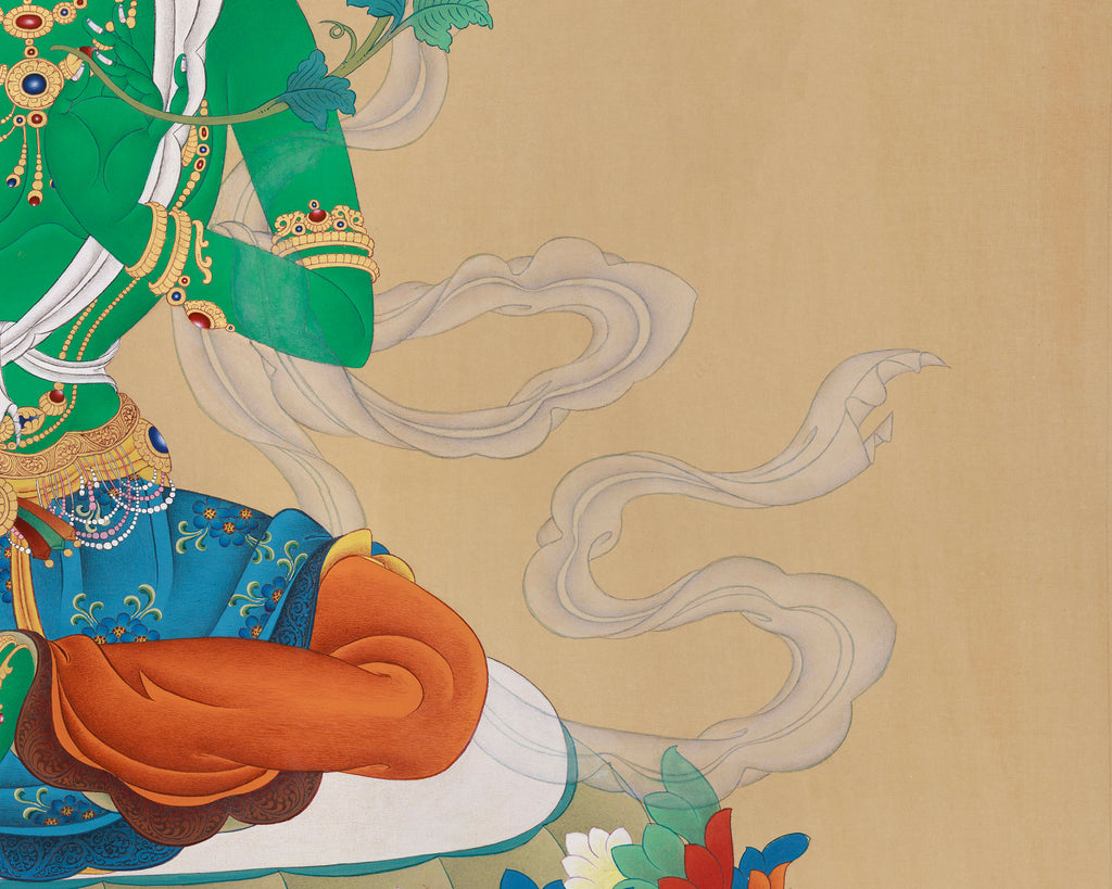 Radiating timeless beauty, this Compassionate Goddess Shyama Tara Thangka stands as a true masterpiece of Tibetan artistry and devotion. Hand-painted on cotton canvas with natural Lhasa stone colors and 24K gold, it showcases artistic mastery and spiritual depth. Using mineral pigments from the Himalayas, it offers rich, lasting hues, while gold highlights add brilliance. Created in the traditional Karma Gadri style, known for serene landscapes and soft color transitions, this thangka embodies harmony of color, composition, and meaning. It is a visual treasure and sacred meditation object radiating Shyama Tara's compassionate presence.