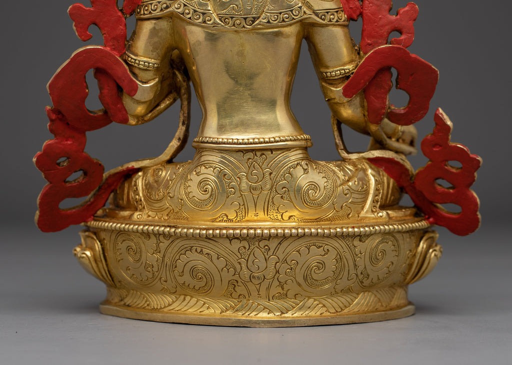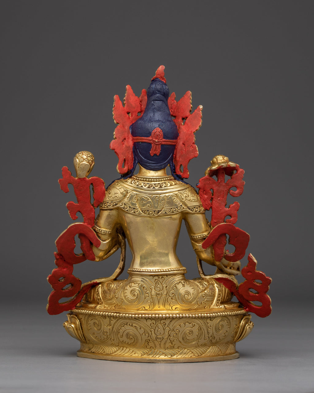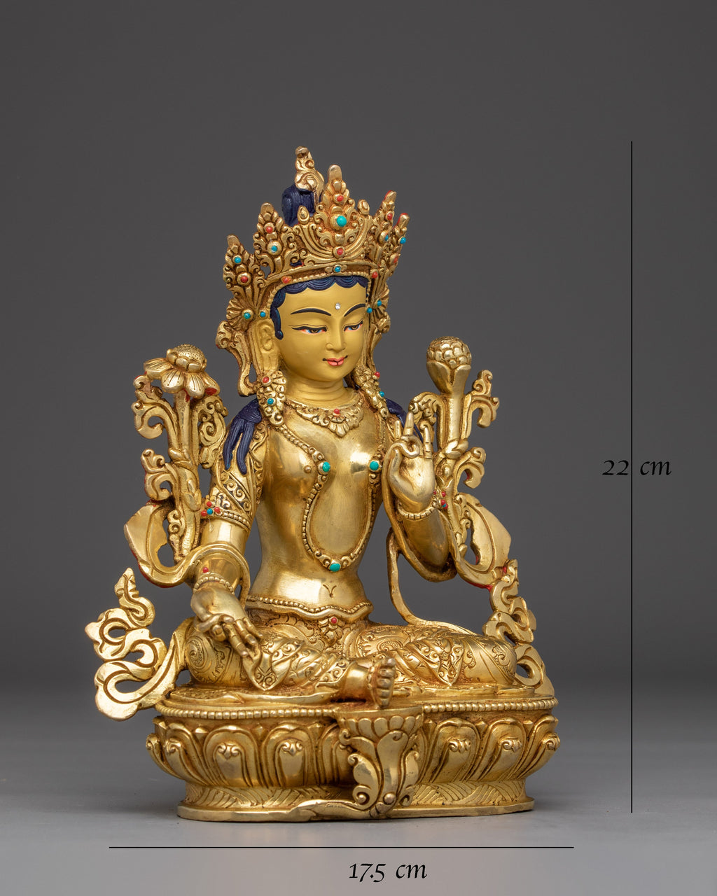 This compassionate green tara copper statue measures 8.7” (22 cm) in height and 6.9” (17.5 cm) at the base and weighs 1.98 kg. Expertly handcrafted from copper, it is richly adorned with 24K gold gilding, detailed gold and acrylic paintings, and embedded gemstones. Designed by skilled Nepali artisans, this statue reflects fine craftsmanship and spiritual elegance, making it an ideal addition to altars, meditation areas, or as a meaningful gift for those seeking tranquility and inspiration.