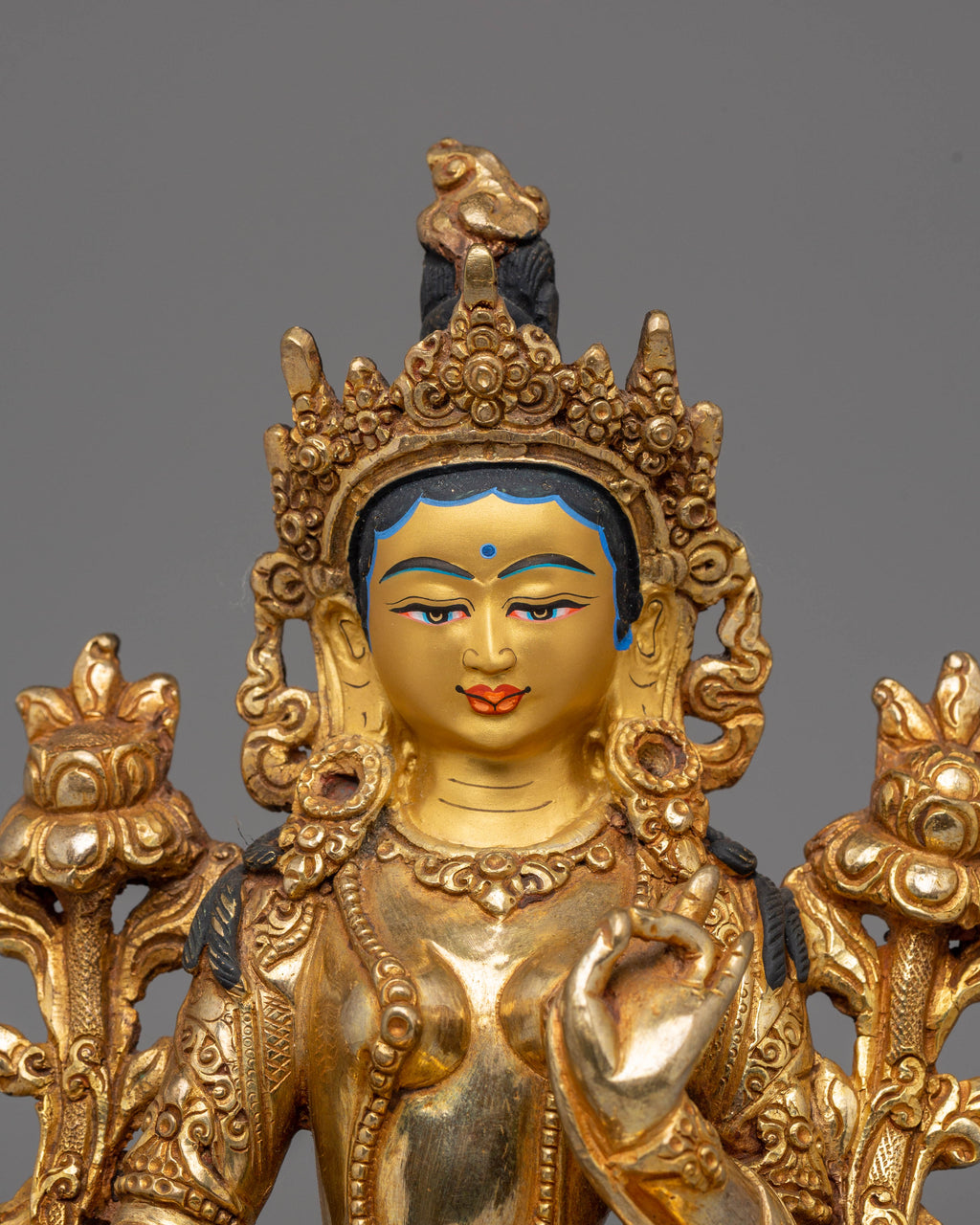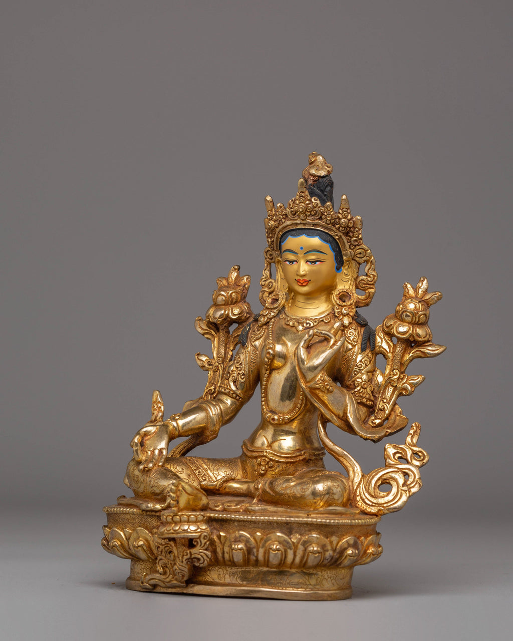 Green Tara is a bodhisattva who embodies swiftness and compassion and is honored in Tibetan Buddhism. She's portrayed as a gorgeous young figurine decked out in decorations. She's frequently sat in a relaxed position with one leg outstretched, poised to answer admirers' summons. The green hue of Tara's body represents life and her connection to charitable endeavors. As a mother figure, she provides beings on their spiritual path with support, protection, and direction. Devotees access Green Tara's compassion and support through prayers and visualizations, using her constant guidance to help them overcome challenges and achieve spiritual goals.