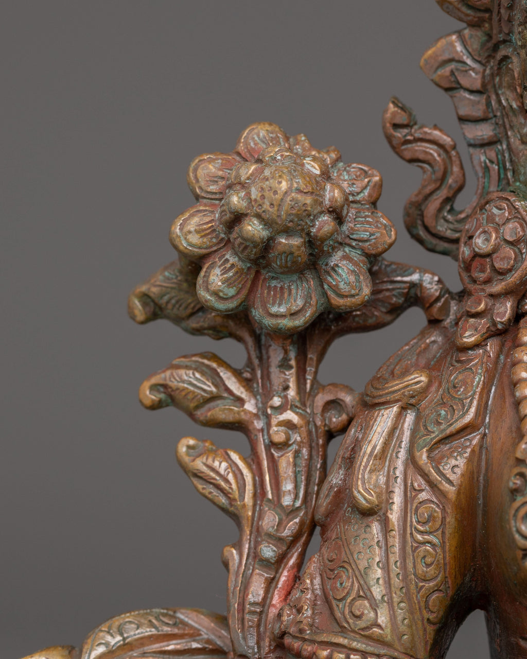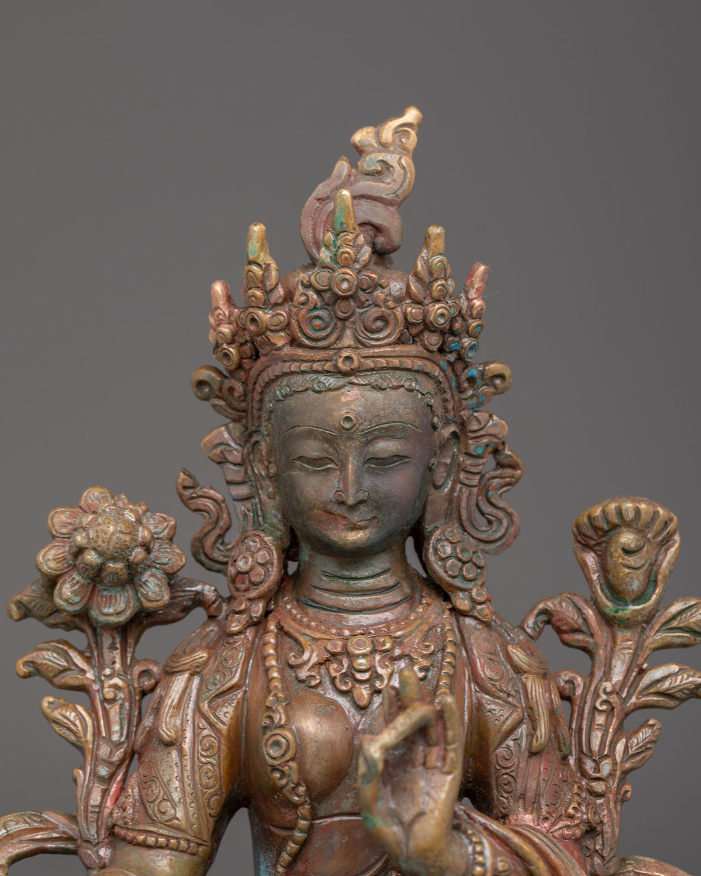 The deity sits gracefully on a lotus seat with a moon disc, holding a utpala flower in each hand. Her left hand is in vitarka mudra for guidance, while her right hand is in varada mudra. Her calm demeanor and stance show a willingness to help (right leg) and inner wisdom (left leg), encouraging meditation and spiritual development. Her serene expression transmits compassion, suggesting a spiritual presence that encourages deep reflection and contemplation, providing serenity and wisdom to those who seek her blessings.