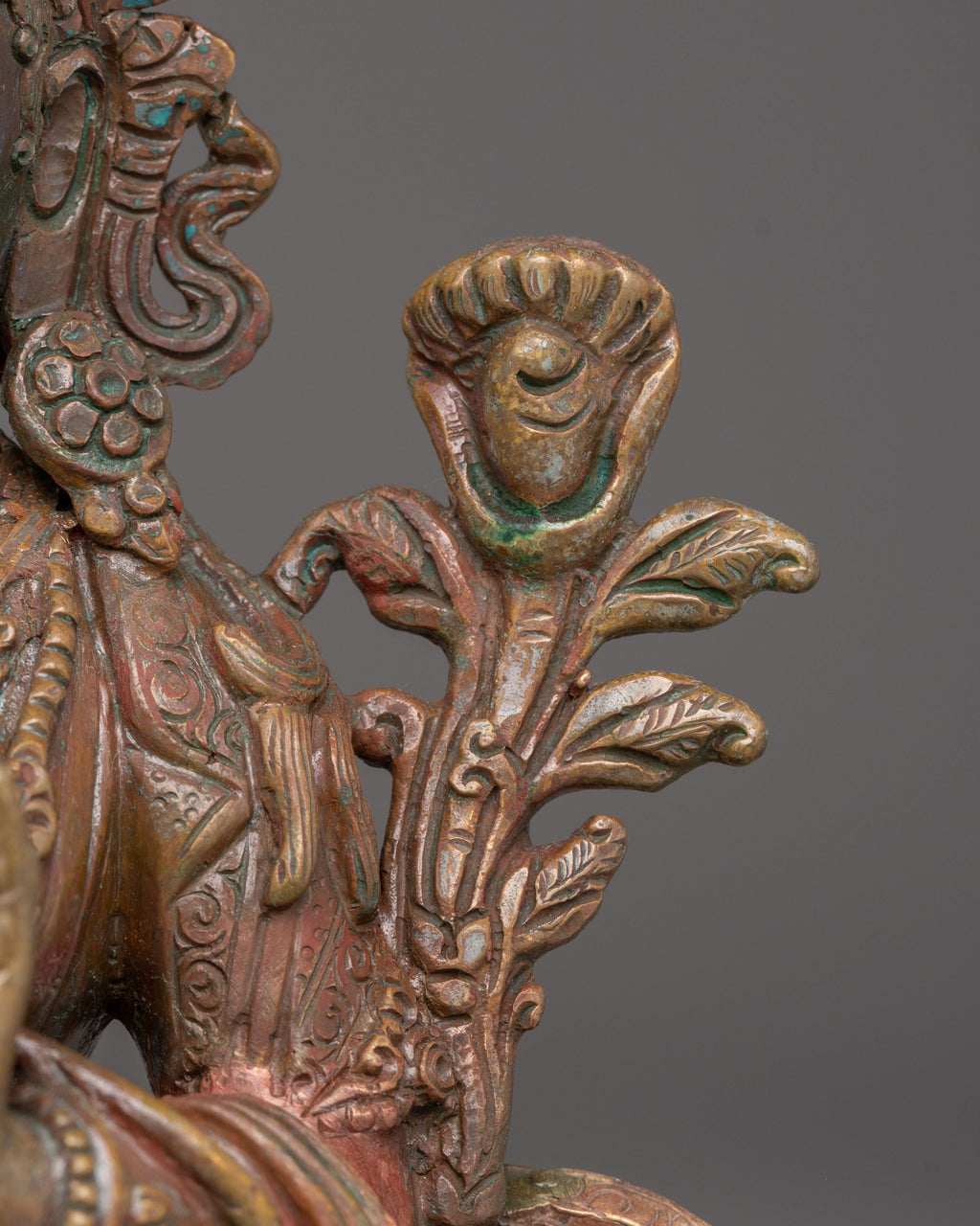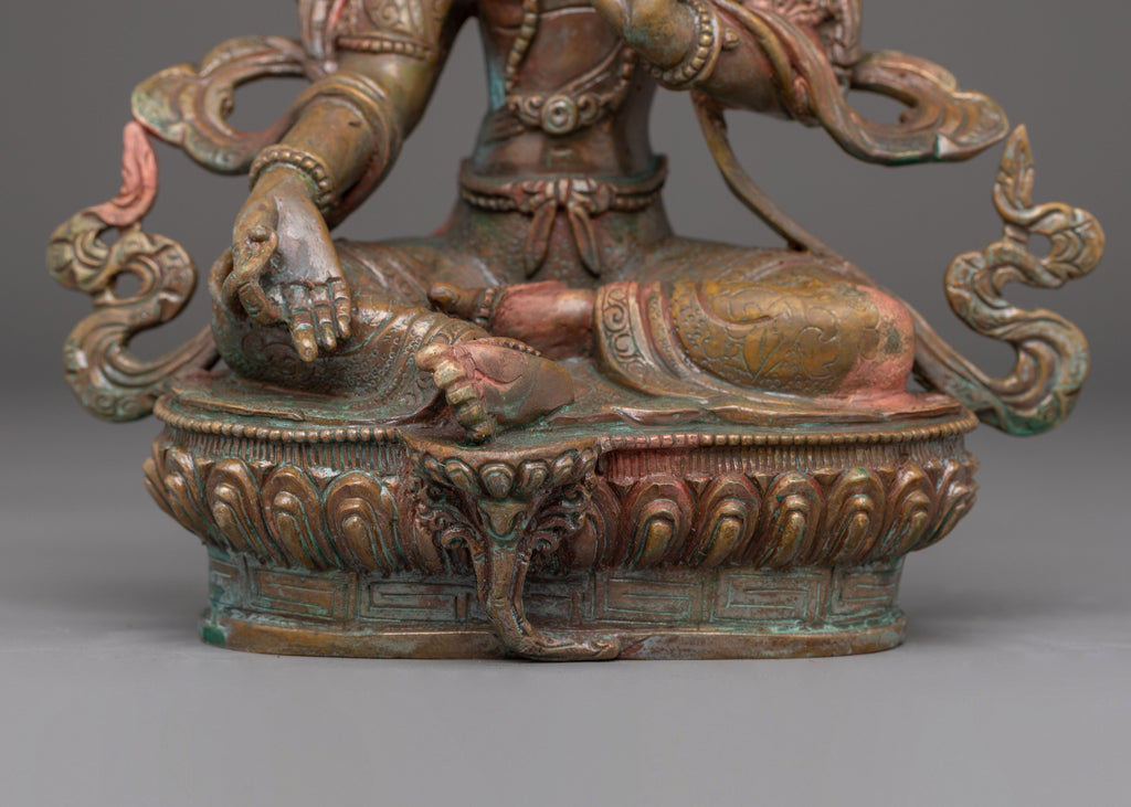 Green Tara is a bodhisattva who embodies swiftness and compassion and is honored in Tibetan Buddhism. She's portrayed as a gorgeous young figurine decked out in decorations. She's frequently sat in a relaxed position with one leg outstretched, poised to answer admirers' summons. The green hue of Tara's body represents life and her connection to charitable endeavors. As a mother figure, she provides beings on their spiritual path with support, protection, and direction. Devotees access Green Tara's compassion and support through prayers and visualizations, using her constant guidance to help them overcome challenges and achieve spiritual goals.