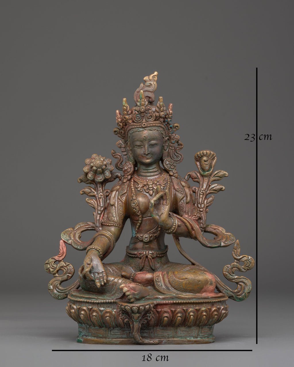The compassionate green Tara figurine represents spiritual protection and compassion. This Buddhist Syamatara Statue brings calm and compassionate energy to spiritual settings. Crafted with care, it represents enlightenment and gives a peaceful refuge for meditation and reflection, making it an excellent addition to holy spaces seeking spiritual upliftment and calm.