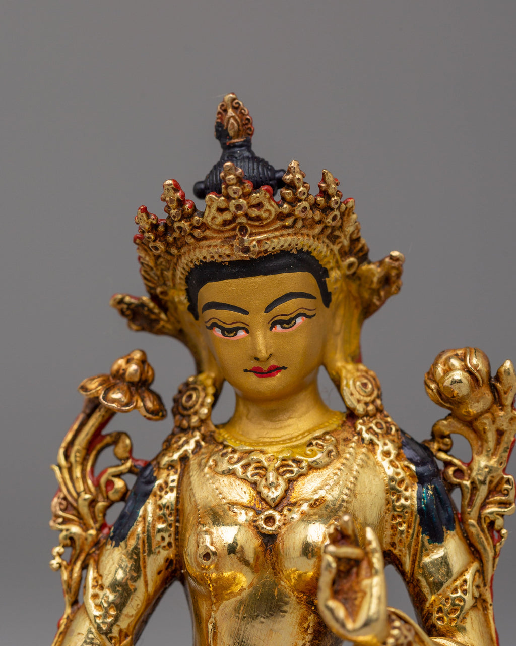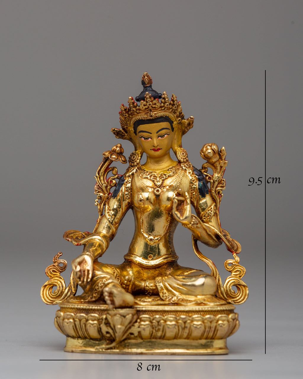 The figurine depicts Green Tara seated gracefully, with one leg extended in a posture of readiness, symbolizing her willingness to assist those in need. The 24K gold plating on her crown, jewelry, and robes adds a radiant and divine aura to the figure, while the acrylic colors bring life and vibrancy to her face and attire. The copper body gives the statue a rich, traditional feel, while the gold accents enhance the purity and spiritual significance of the sculpture, making it a symbol of compassion and healing.