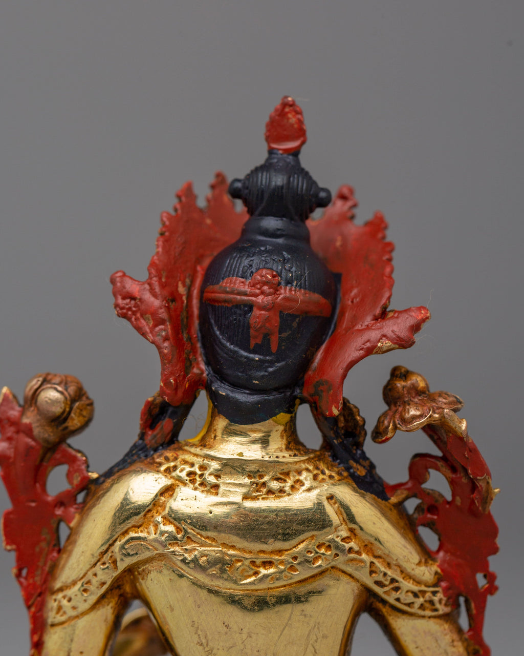 The Compassionate Green Tara Handmade Figurine is a beautiful and intricately crafted representation of Green Tara, the Buddhist goddess of compassion and protection. Standing at 9.5 cm in height and 8 cm in width, and weighing just 0.24 kg, this small yet powerful figurine is made from copper, coated in 24K gold plating, and enhanced with vibrant acrylic colors. Green Tara is known for her swift action in bringing healing, protection, and compassion to those in need, and this figurine captures her divine energy in every detail.