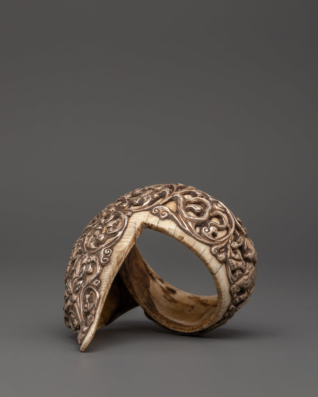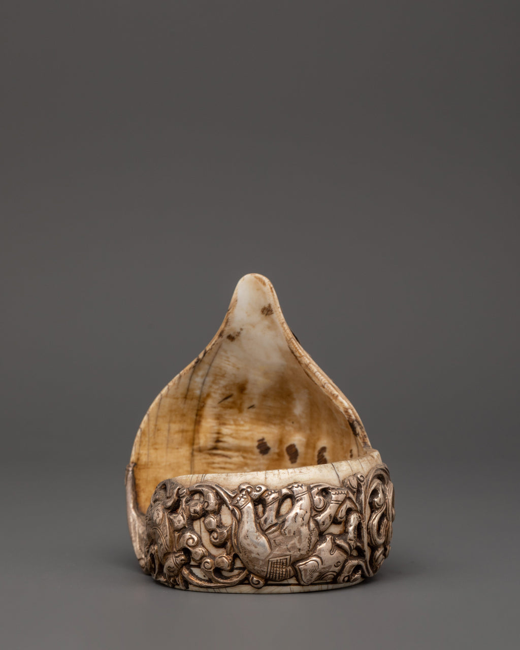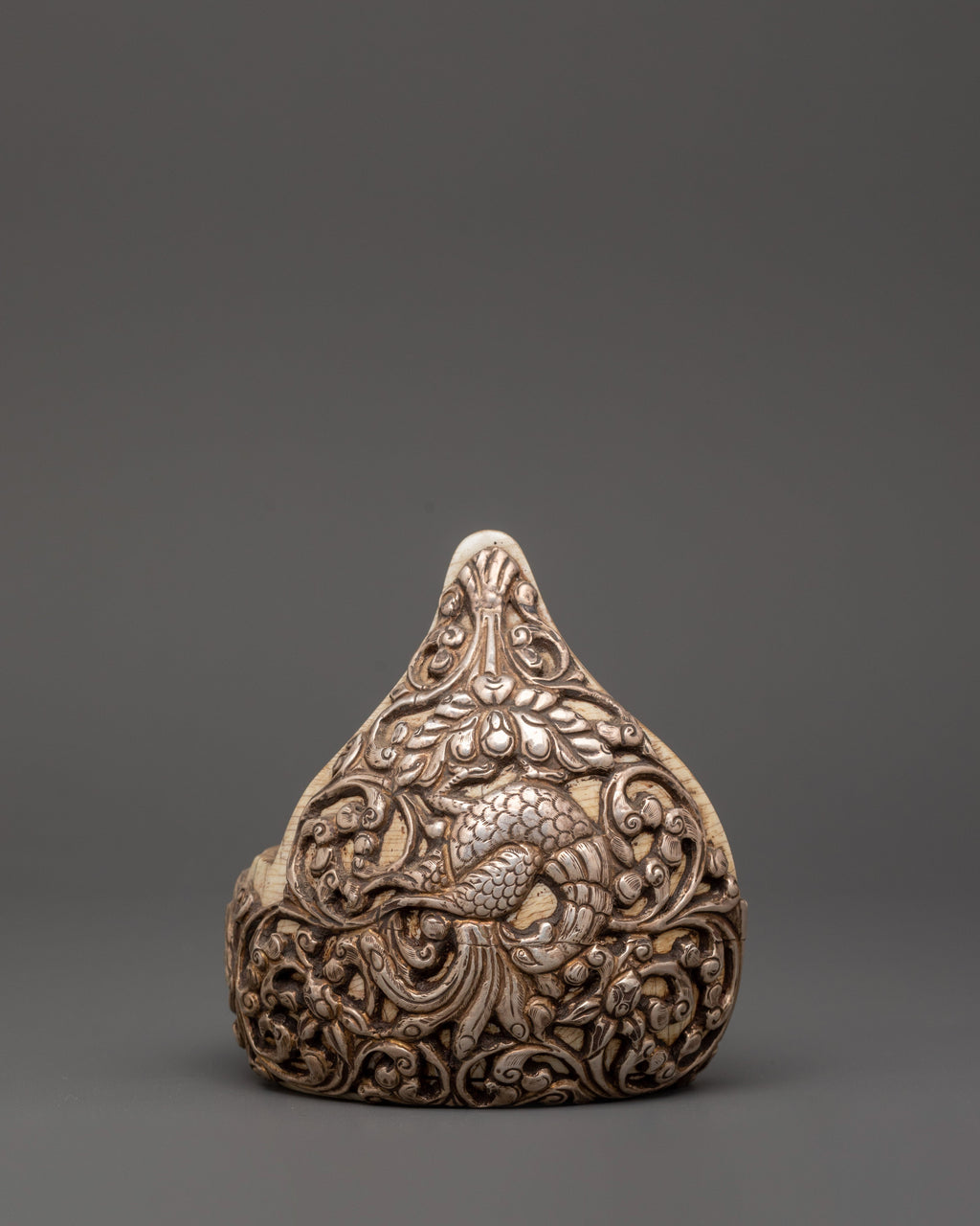 Celebrate the marriage of nature and spirituality with this magnificent Handcrafted Conch Shell Bangle, which is inlaid with pure silver and has intricate floral and animal carvings. This ceremonial bracelet measures 6.2cm in diameter and weighs 0.19kg. It is crafted of conch shell, which is venerated in Tibetan Buddhism as a symbol of the Dharma's powerful voice and purity.