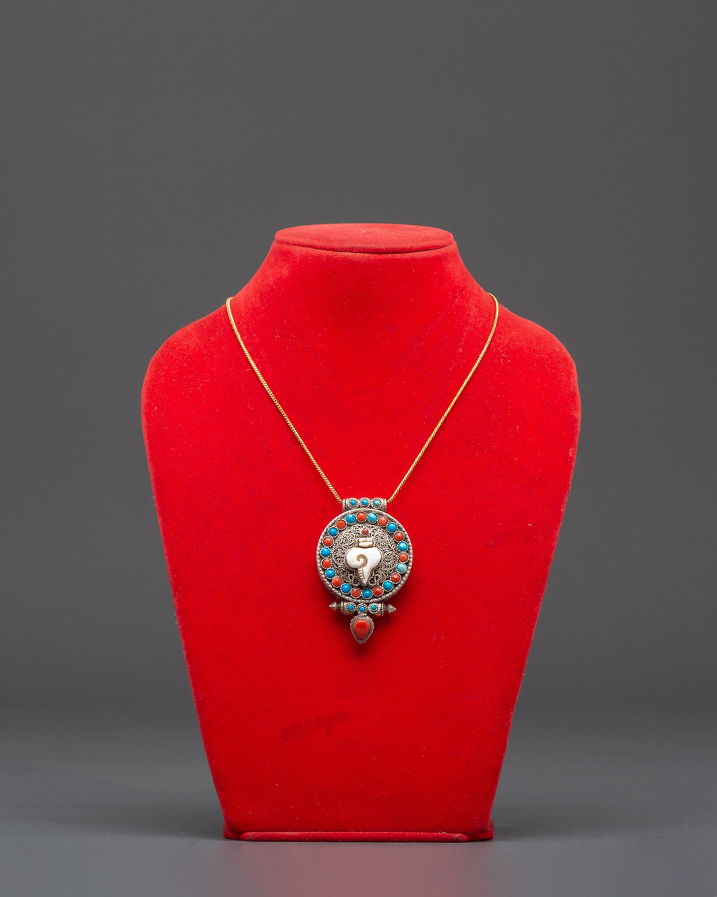 Tibetan Conch Shell Silver Ghau Pendant | Turquoise & Coral for Spiritual Significance