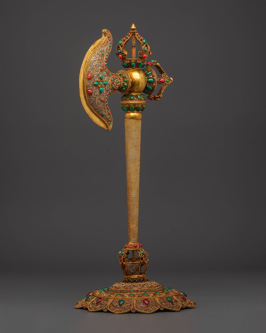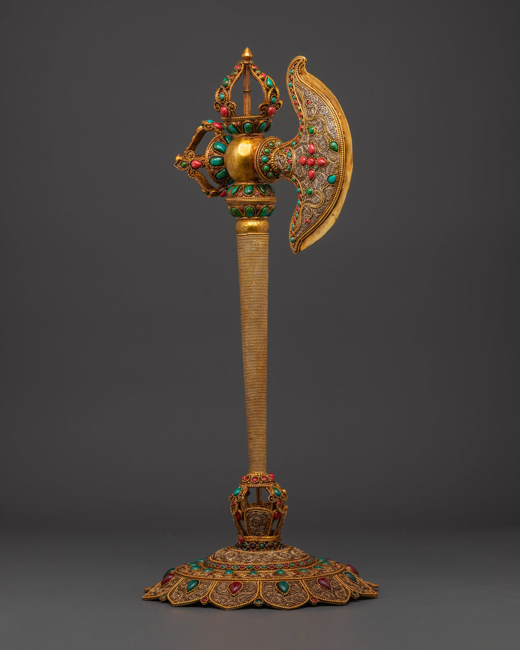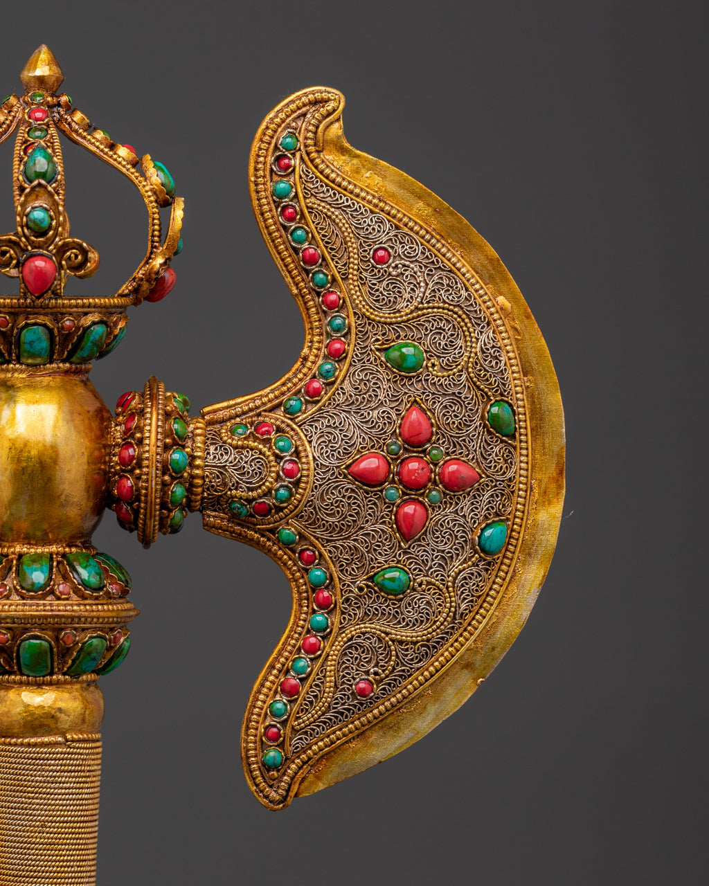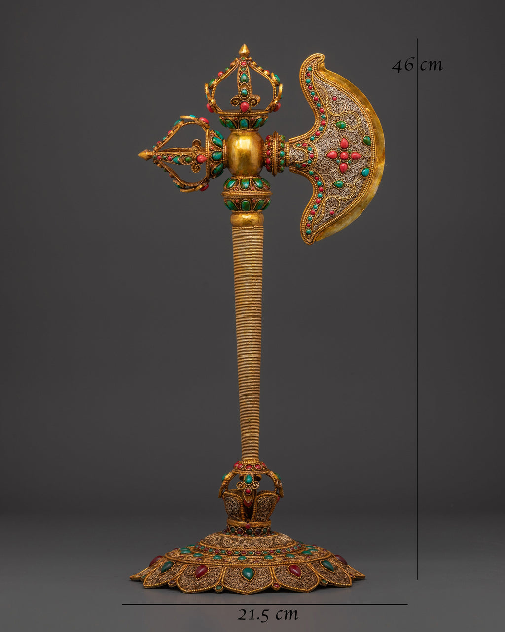 This gold-plated copper axe is not just a decorative item but a powerful symbol used in various religious practices. Whether for Hindu, Buddhist, or other spiritual rituals, it plays a vital role in purification and protection during ceremonies. Its detailed design, combined with the sacred meaning behind its materials, makes it an essential and cherished tool for those seeking to deepen their spiritual connection. The copper body, gold plating, and stones create a harmonious blend of aesthetics and spirituality, making this axe a must-have for anyone involved in sacred practices or ritualistic ceremonies.