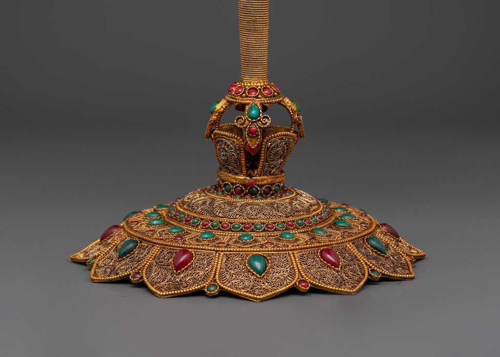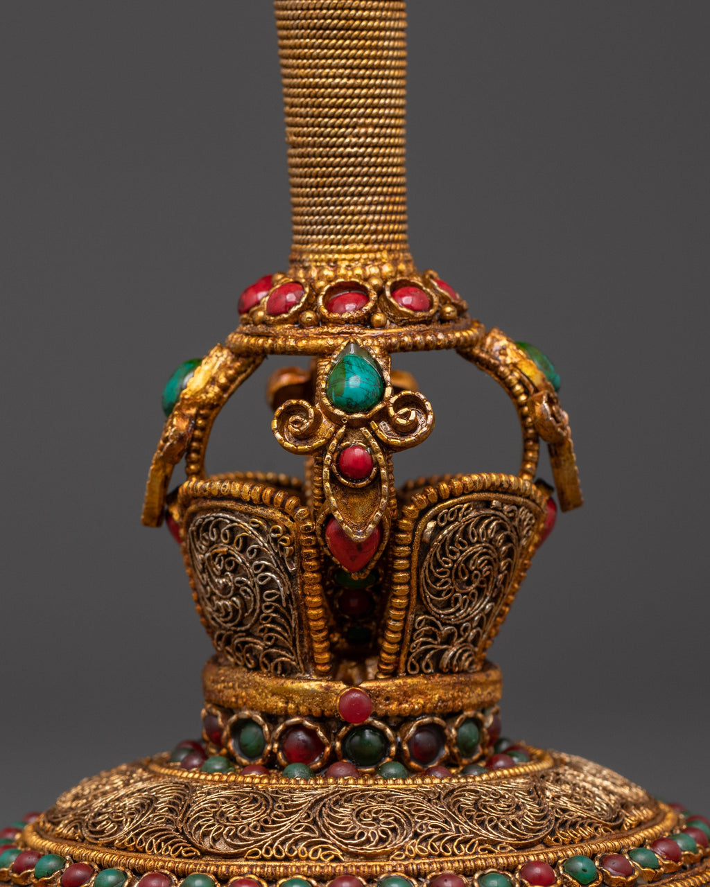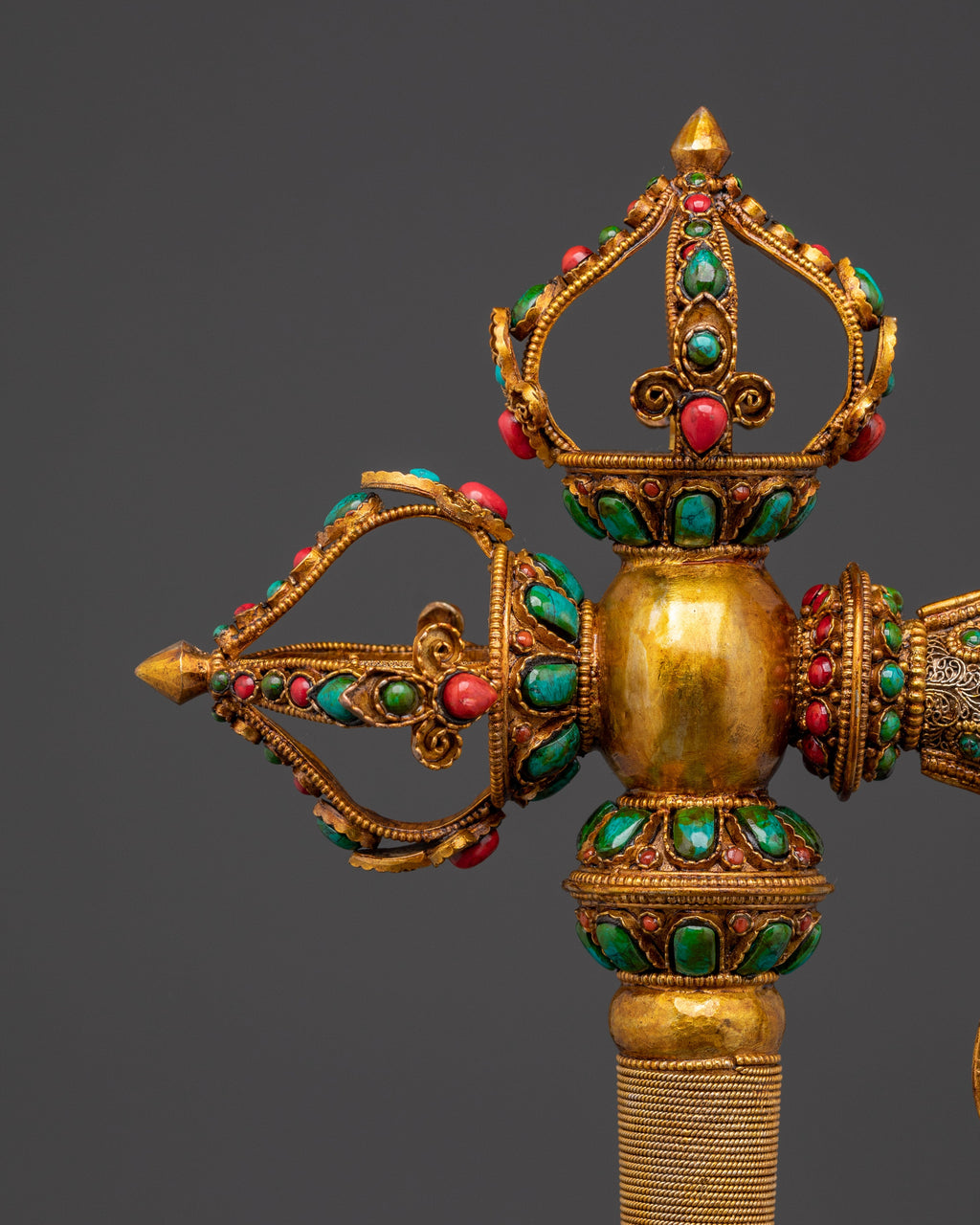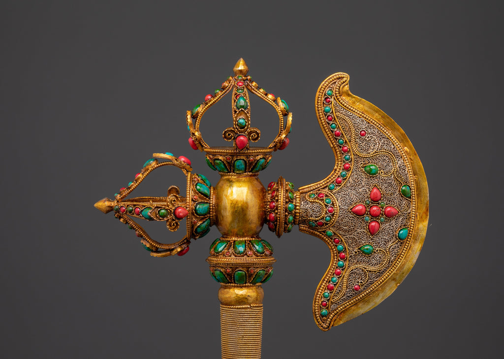 This gold-plated copper axe is not just a decorative item but a powerful symbol used in various religious practices. Whether for Hindu, Buddhist, or other spiritual rituals, it plays a vital role in purification and protection during ceremonies. Its detailed design, combined with the sacred meaning behind its materials, makes it an essential and cherished tool for those seeking to deepen their spiritual connection. The copper body, gold plating, and stones create a harmonious blend of aesthetics and spirituality, making this axe a must-have for anyone involved in sacred practices or ritualistic ceremonies.
