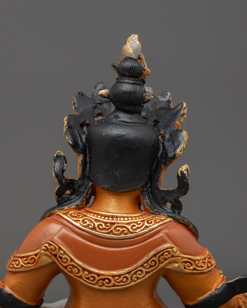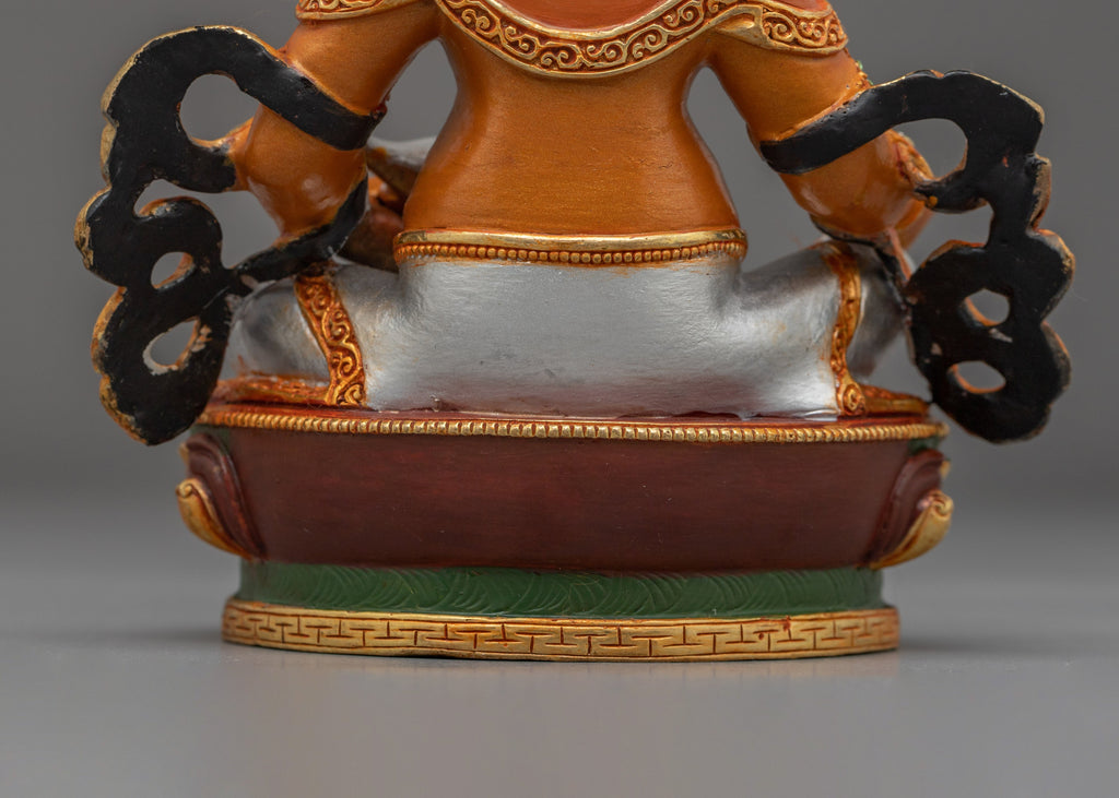 Expertly handcrafted from copper and gold-plated, this piece radiates beauty and sacred power. Artisans have enhanced it with acrylic color detailing, accentuating the deity’s garments, ornaments, and features with vibrant hues. The combination of gold and color reflects Dzambhala’s dual aspect—spiritual enlightenment and worldly abundance. Each detail, from the jewel in his hand to the serene gaze, captures the artistry and devotion of traditional Himalayan metalwork.