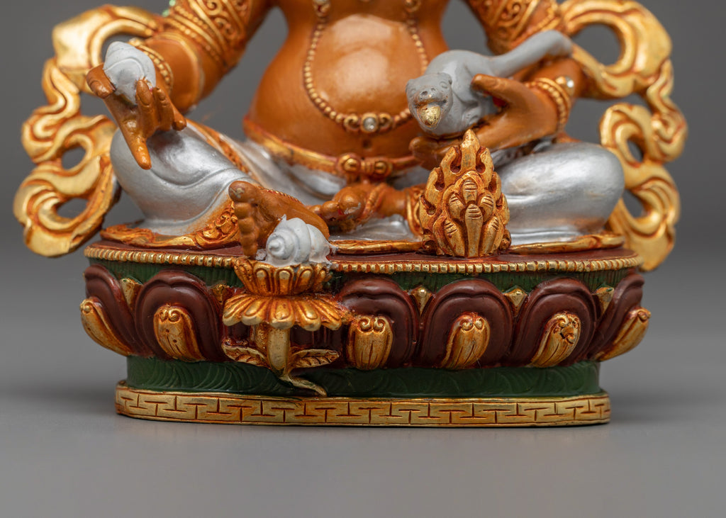 Dzambhala is a protective deity associated with wealth and prosperity. Many forms and traditions are associated with this wealthy deity, but he is usually depicted as yellow in color and holding a mongoose in his left hand. This statue has accurate traditional iconography and fine details.