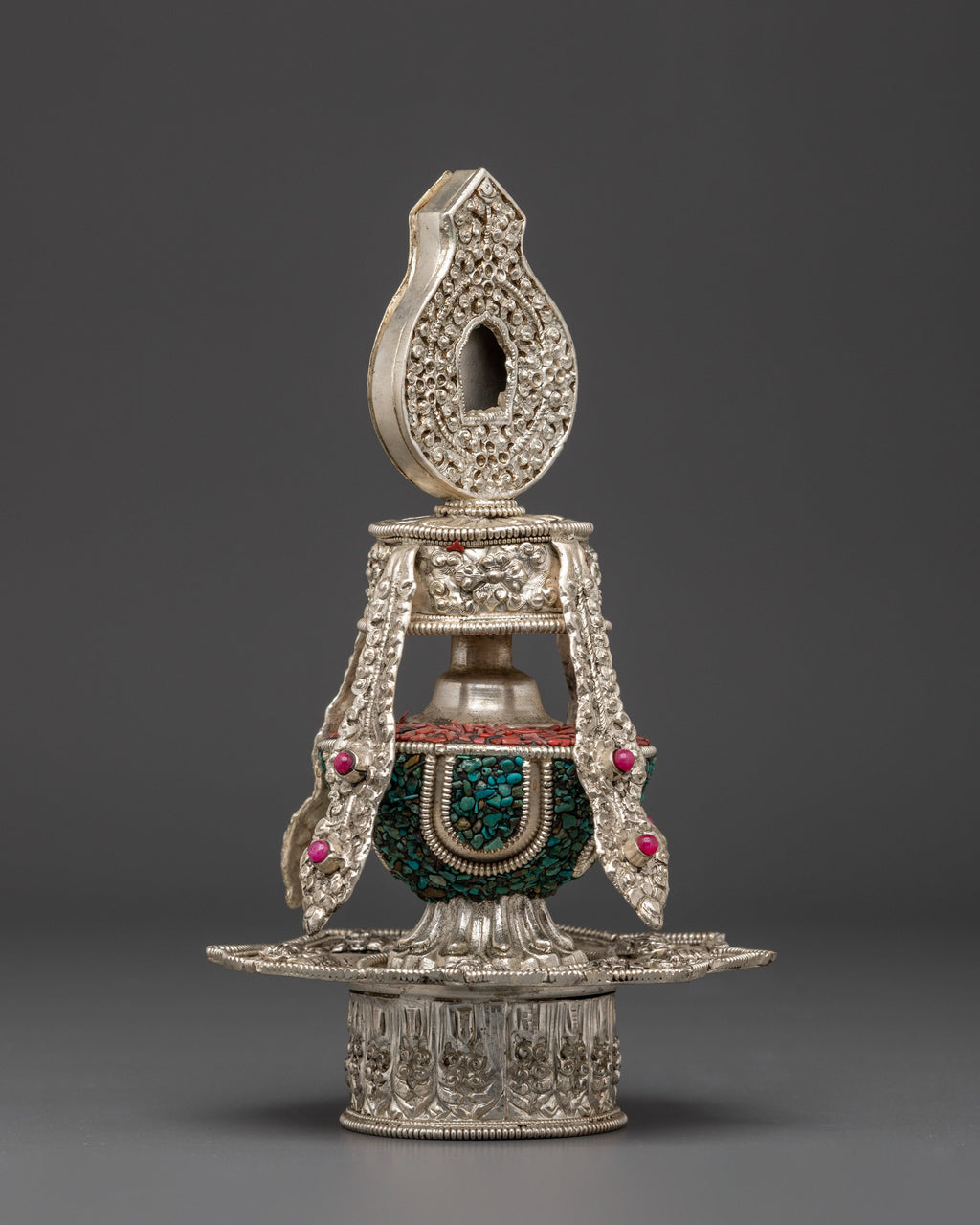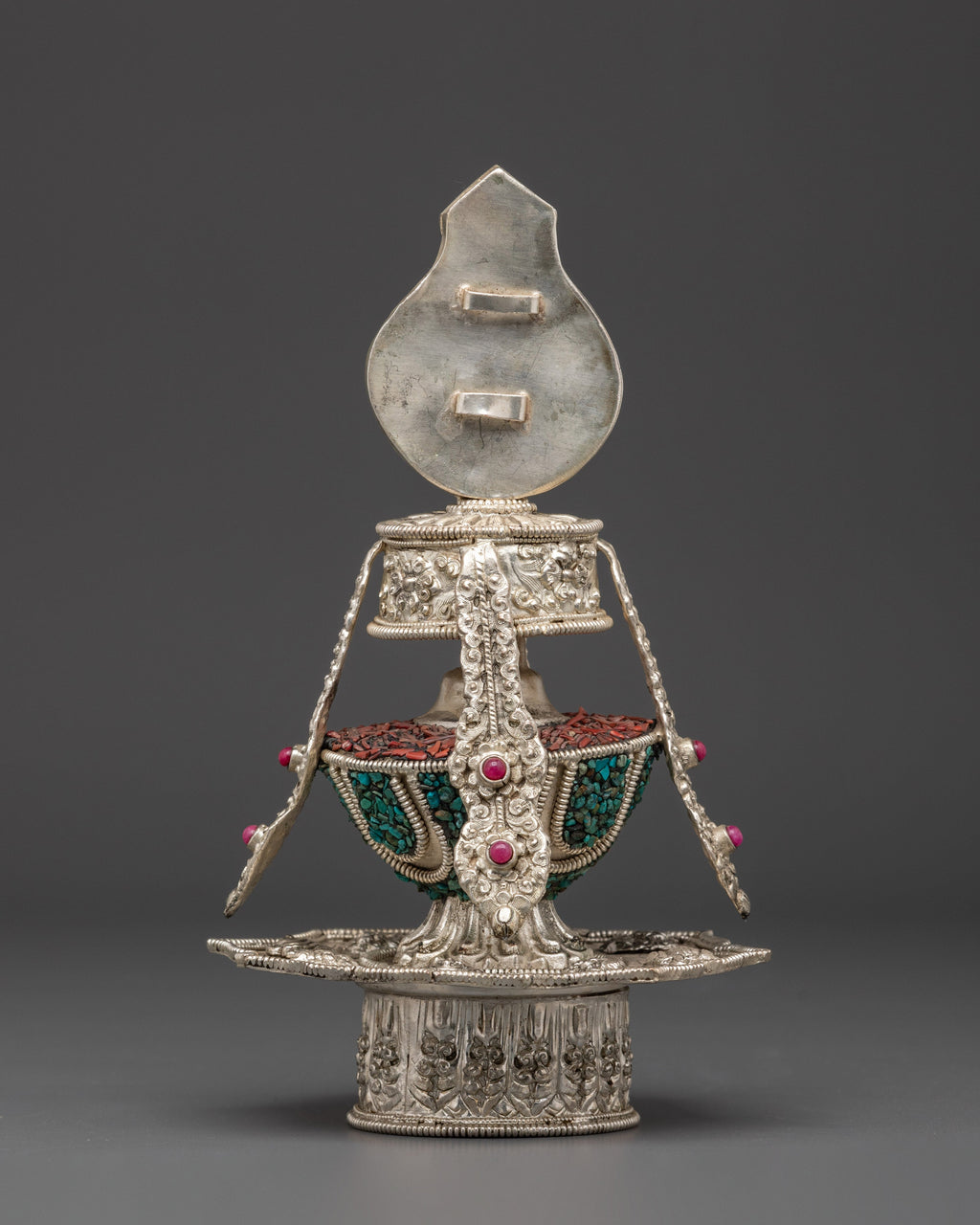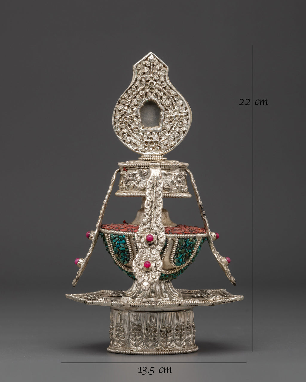 The Handcrafted Copper Life Vase is a remarkable creation made from copper and beautifully embellished with turquoise, ruby, coral, and original stones. Measuring 22 cm in height and 13.5 cm in width, this vase is more than just a decorative item it embodies vitality, protection, and spiritual growth. Rooted in Tibetan ritual tradition, the Life Vase serves as a sacred symbol of life force and the cultivation of positive energies. Its exquisite craftsmanship and meaningful design make it an essential piece for anyone seeking to deepen their spiritual practice or enhance their living space with a powerful, uplifting presence. Elevate your environment and spirit with this unique and inspiring vase.