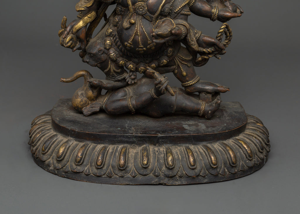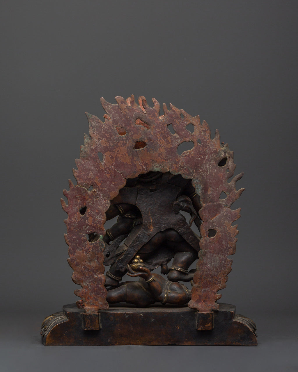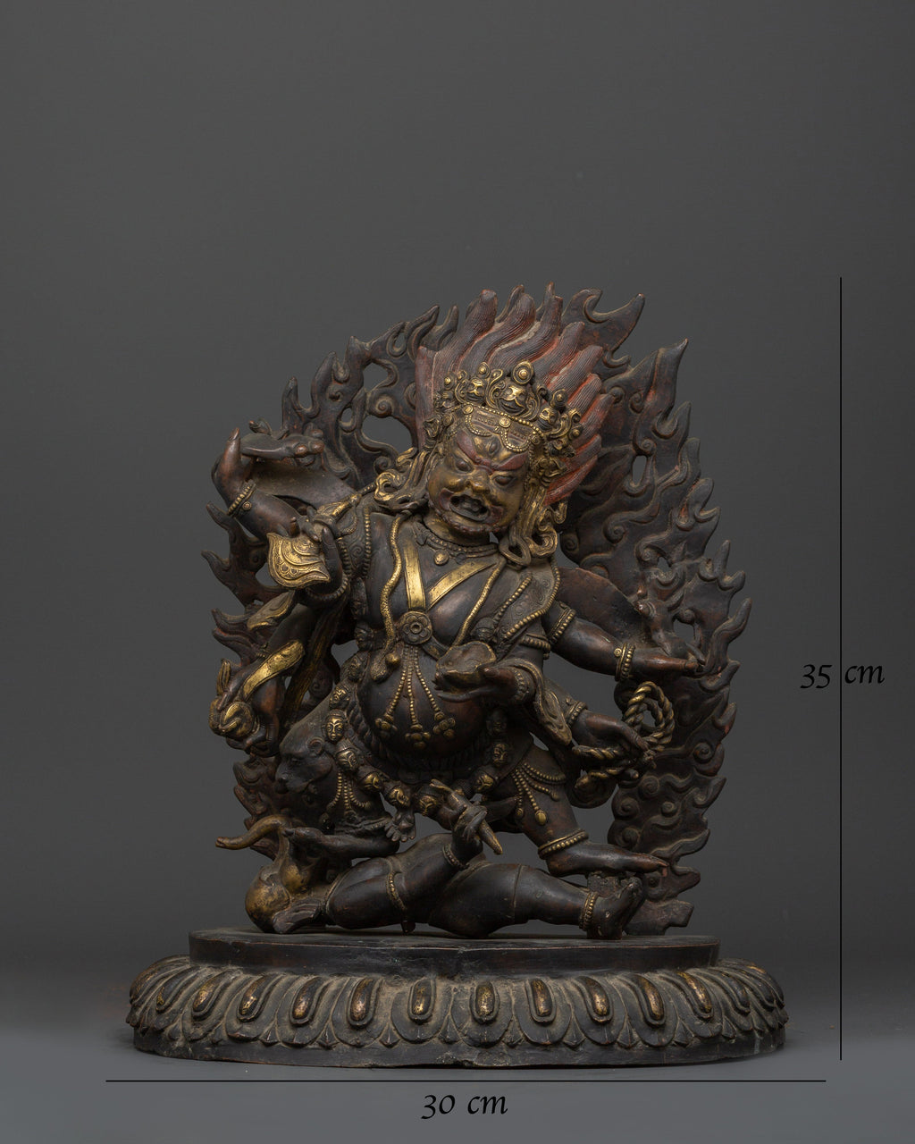 This significant and influential item, weighing 9.09kg, is intended to symbolize power, knowledge, and spiritual protection. Each specified detail, from the blazing halo to the deity's furious look, is meticulously crafted to represent Mahakala's responsibilities as an obstacle remover and defender of dharma.
