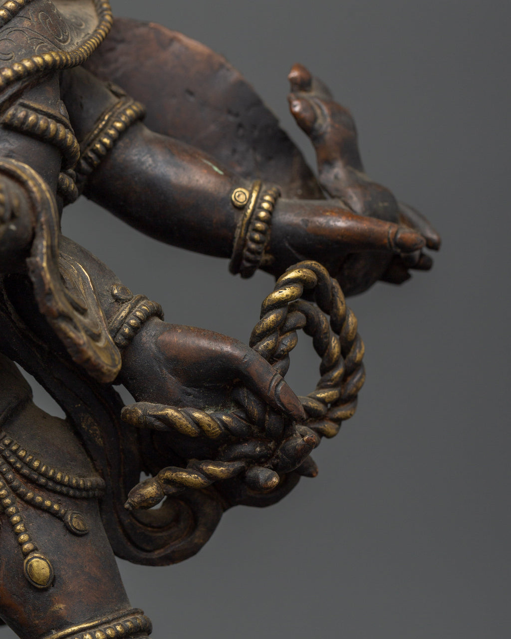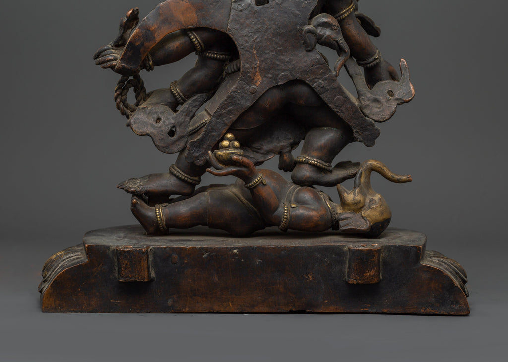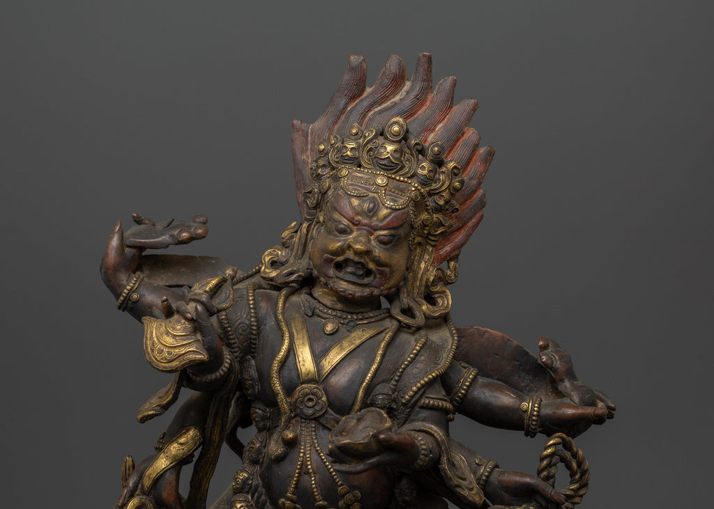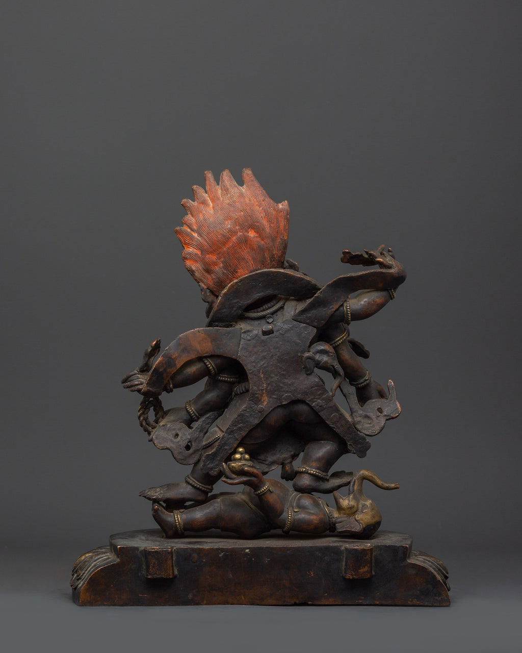 This significant and influential item, weighing 9.09kg, is intended to symbolize power, knowledge, and spiritual protection. Each specified detail, from the blazing halo to the deity's furious look, is meticulously crafted to represent Mahakala's responsibilities as an obstacle remover and defender of dharma.