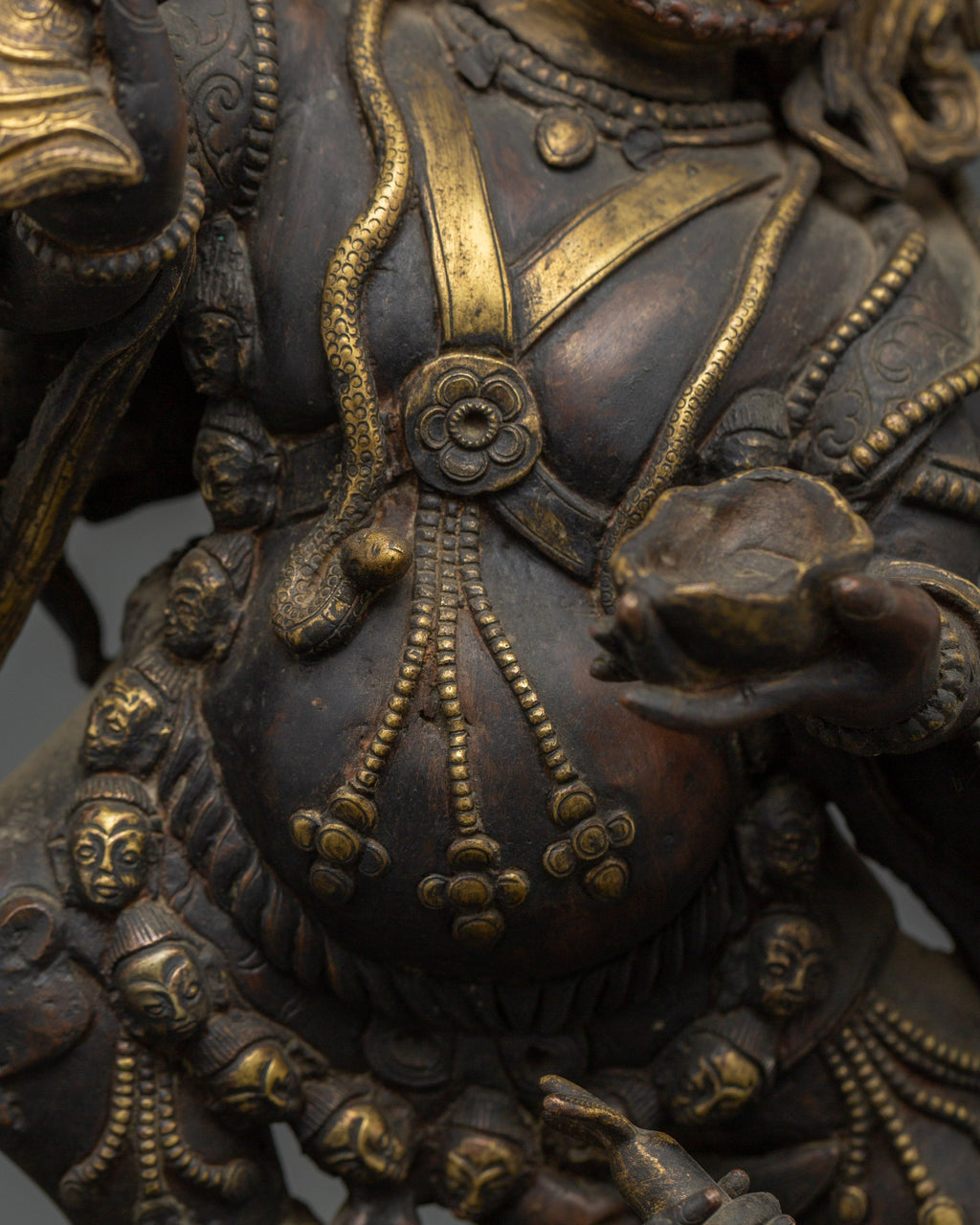 Elevate your sacred space with this Copper Mahakala Statue, an adequate representation of the Buddhist protector deity. This magnificent figurine stands 35cm tall and features meticulous copper workmanship, gold plating, and an antique finish, perfectly capturing Mahakala's powerful, protective presence.
