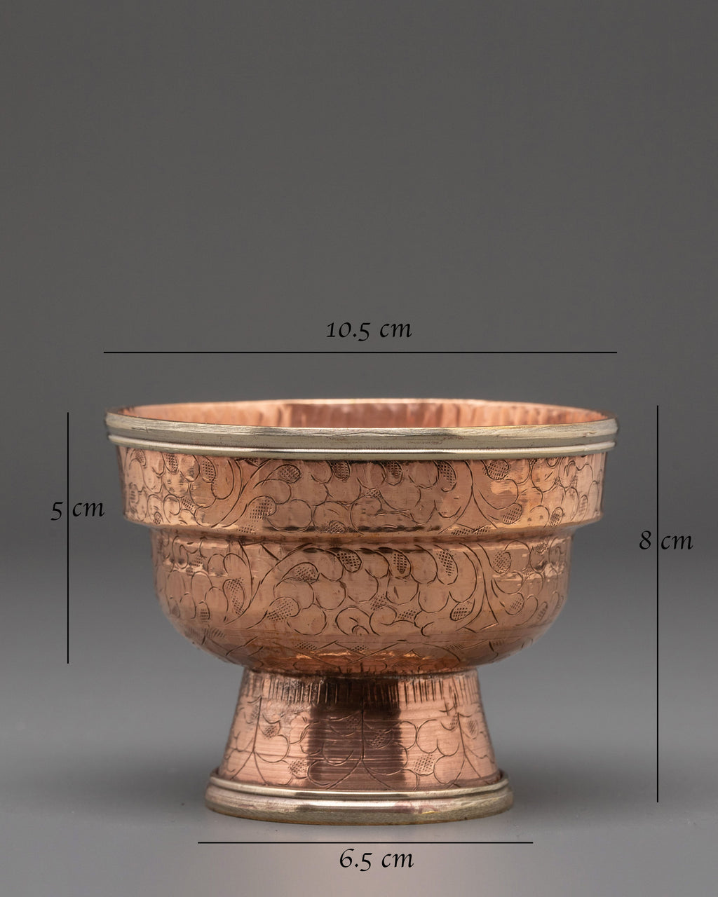 The bowls feature gently hammered textures and smooth white metal rims, highlighting the artistry of Himalayan craftsmanship. The warm copper surface symbolizes purity and clarity, while the white metal detailing represents spiritual protection. Together, these materials create a timeless and harmonious aesthetic that enhances the sacred energy of any altar. The craftsmanship reflects traditional Tibetan design, making each bowl a meaningful representation of devotion and mindful offering.