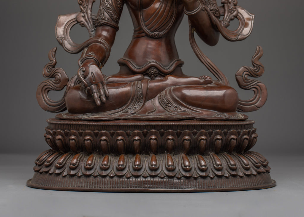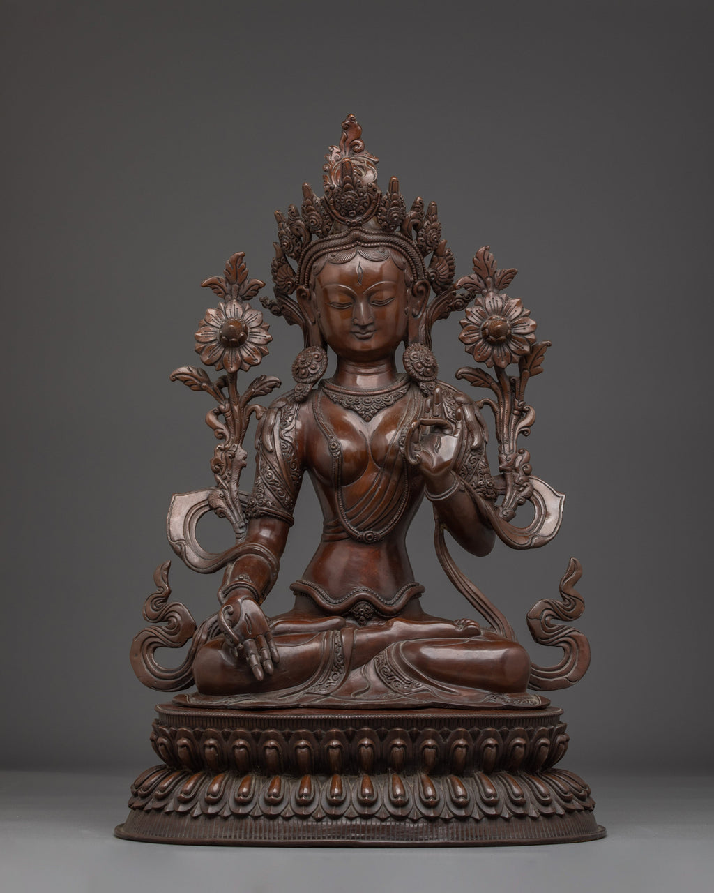The Copper Sculpture of White Tara stands at 19.7”/50cm in height, with a base width of 13.2”/33.5cm, and weighs 9.02 kg. Handcrafted from Oxidized copper, it showcases the serene presence of White Tara, revered in Tibetan Buddhism as the Goddess of Compassion and Longevity. White Tara is invoked for healing, protection, and long life, making this statue a powerful spiritual centerpiece for meditation and devotion.