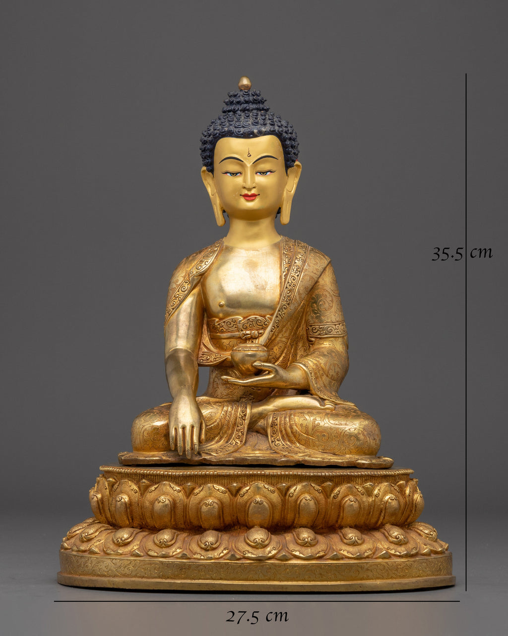 This Copper Shakyamuni Buddha in Bhumisparsha Mudra is an intricately crafted statue, standing 35.5cm in height and 27.5cm in width, made from copper and fire-gold plated for an elegant finish. The Bhumisparsha Mudra, also known as the "earth-touching" gesture, represents the Buddha's call for the earth to witness his enlightenment, symbolizing spiritual awakening and the overcoming of obstacles.