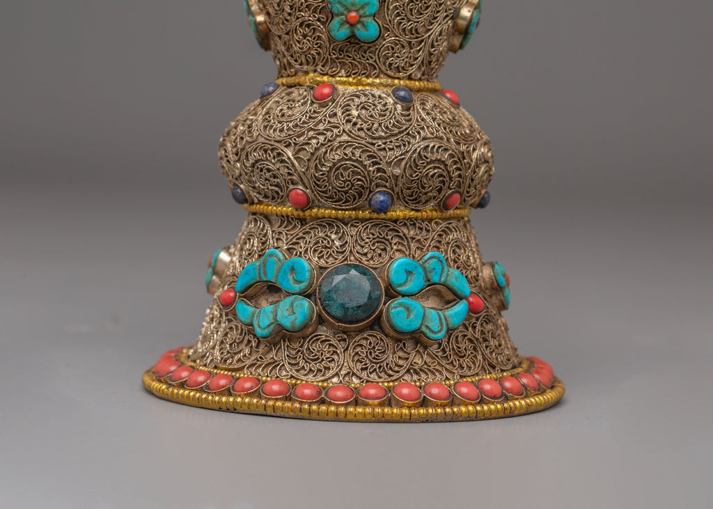 This Copper Stamp for Decor is a striking piece that blends intricate craftsmanship with cultural significance. The copper body is adorned with carefully arranged semi-precious stones such as coral and turquoise, giving it a vibrant and timeless appeal. The design motifs reflect traditional Buddhist art, offering both aesthetic beauty and spiritual symbolism. Perfect for collectors or those who appreciate the unique combination of art and culture, this copper stamp adds a touch of elegance and spiritual energy to any space.
