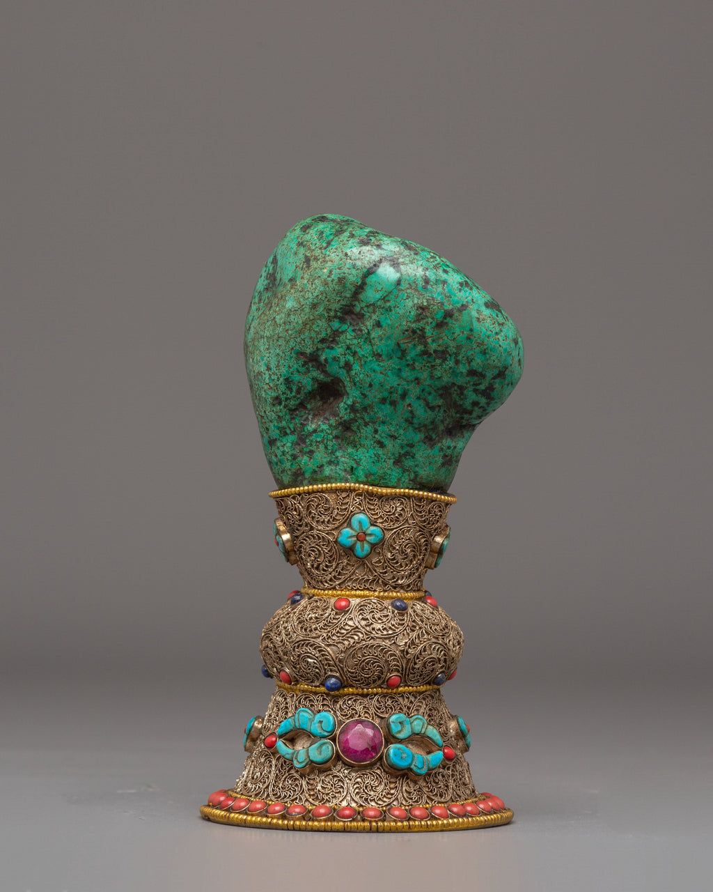 Perfect for anyone interested in Buddhist decor or traditional artisan craftsmanship, this copper stamp is a must-have item for spiritual homes or offices. Its compact yet detailed design makes it a great gift or personal item to add to any collection. The semi-precious stones enhance the decorative appeal.