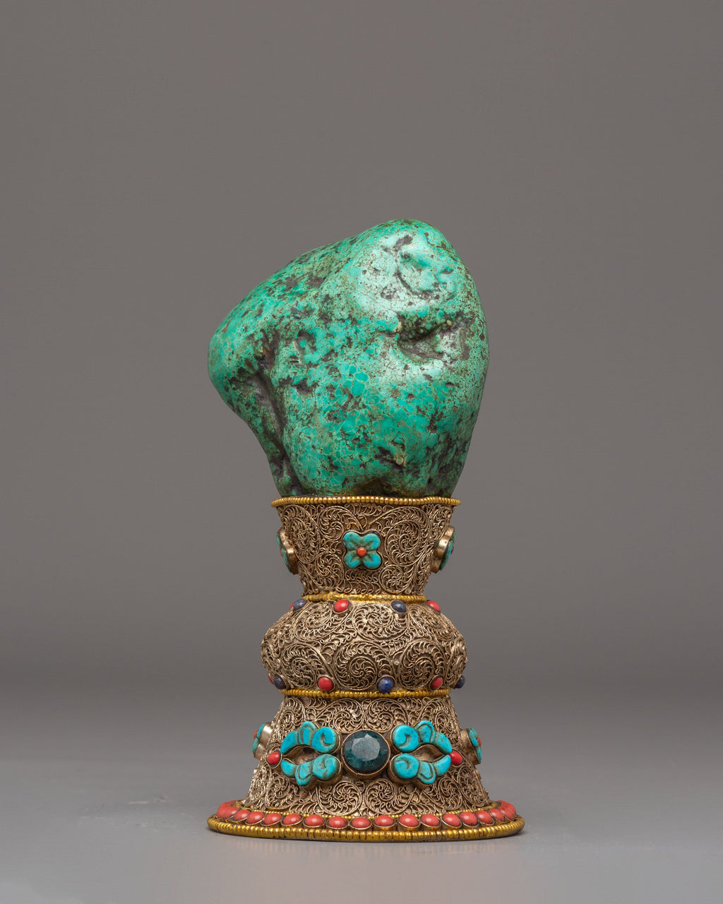 The semi-precious stones incorporated into the design—coral and turquoise—hold significant meaning in various cultures. Coral is often seen as a symbol of protection, while turquoise is associated with healing and prosperity. These stones, combined with the sturdy copper body, create a piece that is not only visually appealing but also spiritually powerful. Whether displayed as part of an altar decor or used in a traditional ritual setting, this copper stamp serves as a reminder of the deep-rooted traditions it represents.