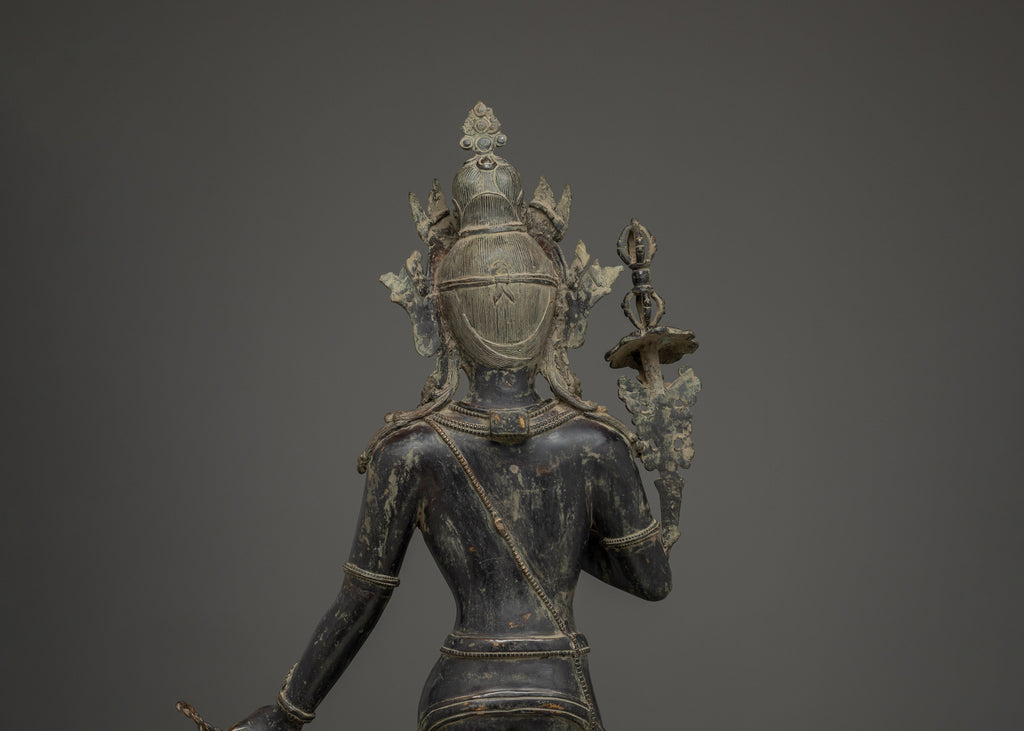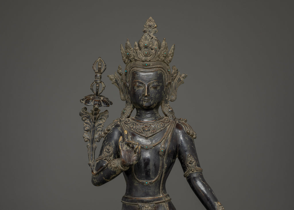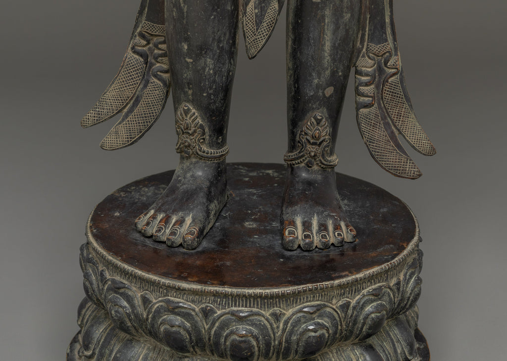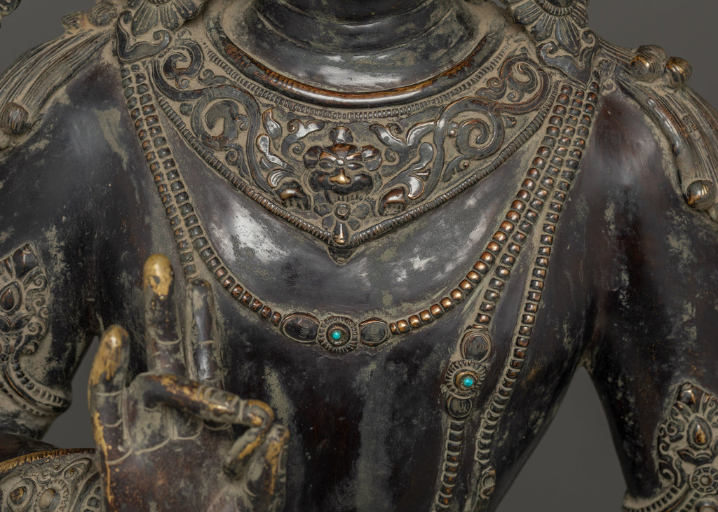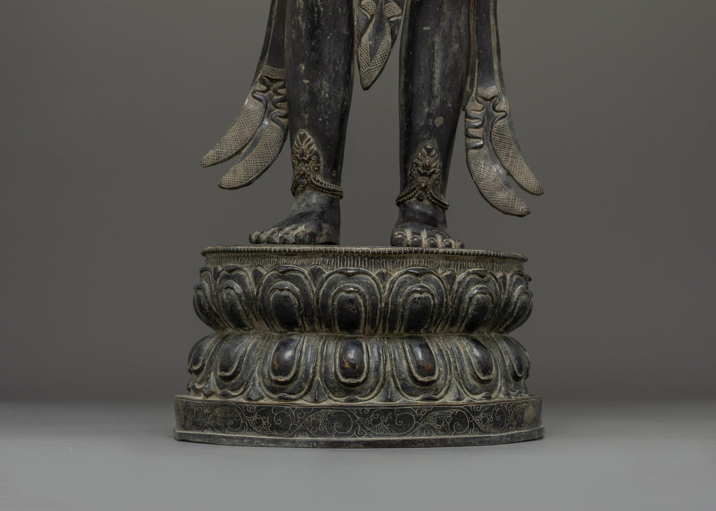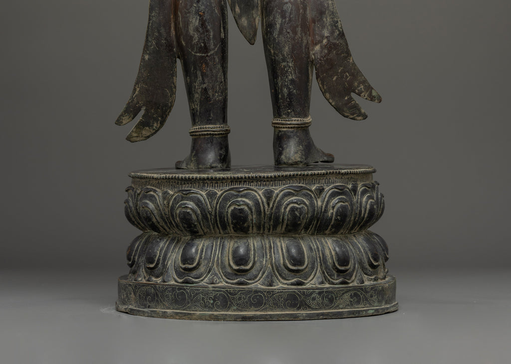This Oxidized Copper Standing Vajrapani Statue represents the embodiment of spiritual strength and protection within Buddhist tradition. Standing majestically at 101.5 cm, this striking figure portrays Vajrapani—the Protector of the Buddha and the manifestation of all enlightened power. His fierce expression, dynamic posture, and powerful stance signify the conquering of ignorance and fear, reminding practitioners of the unwavering strength of wisdom. Crafted from an oxidized copper body, the statue exudes an ancient, dignified presence that enriches any altar, monastery, or meditation space.