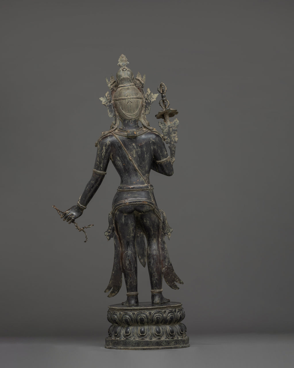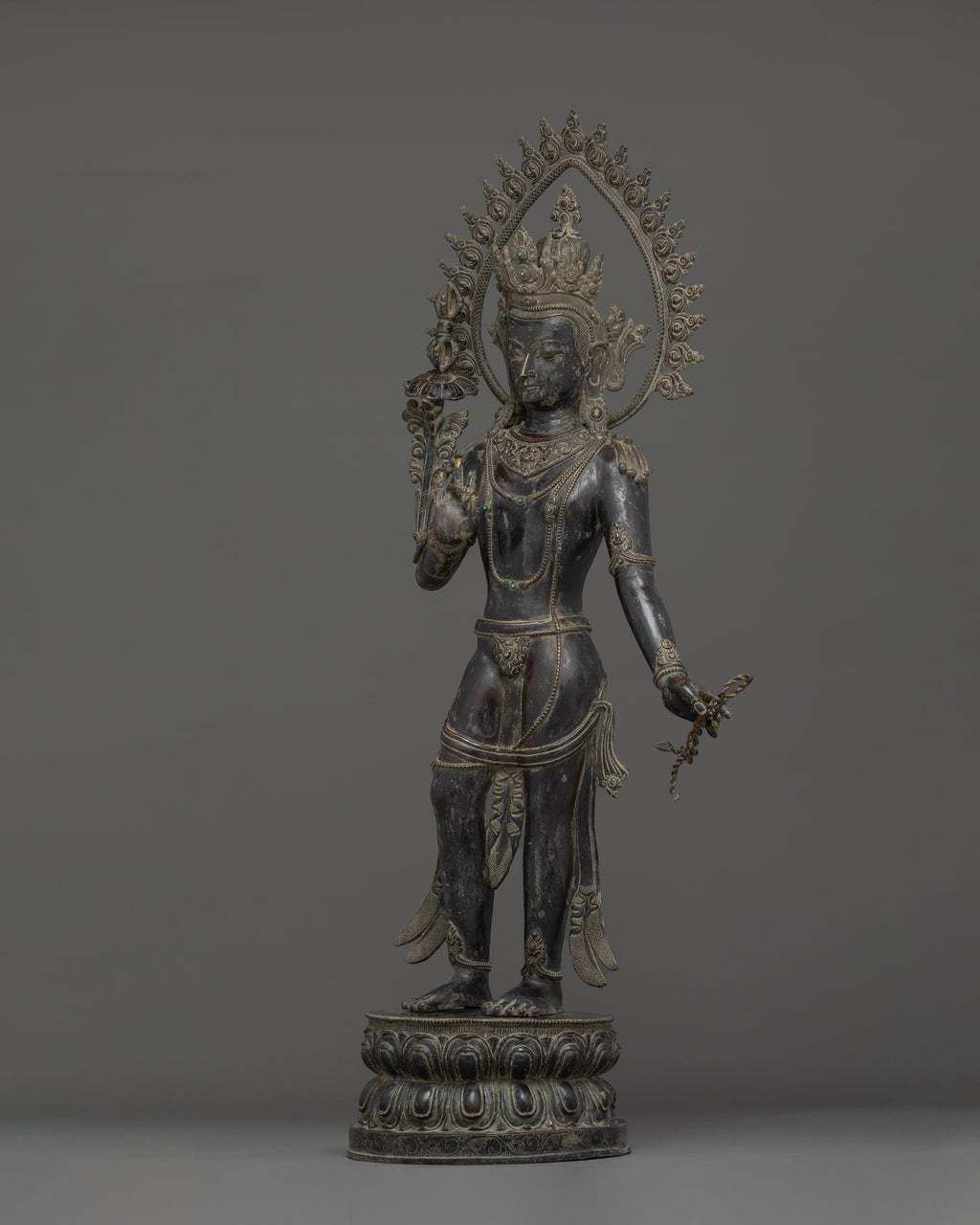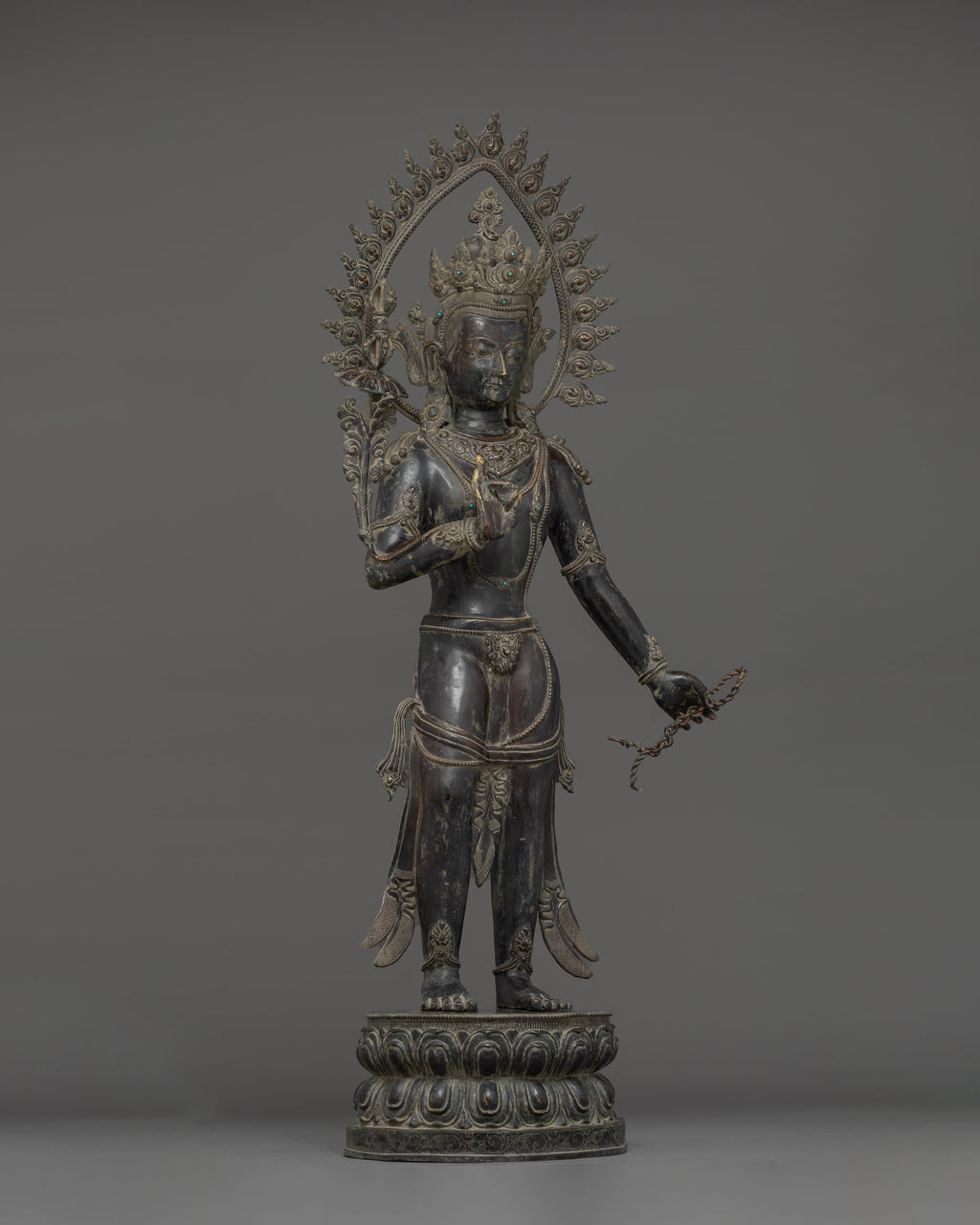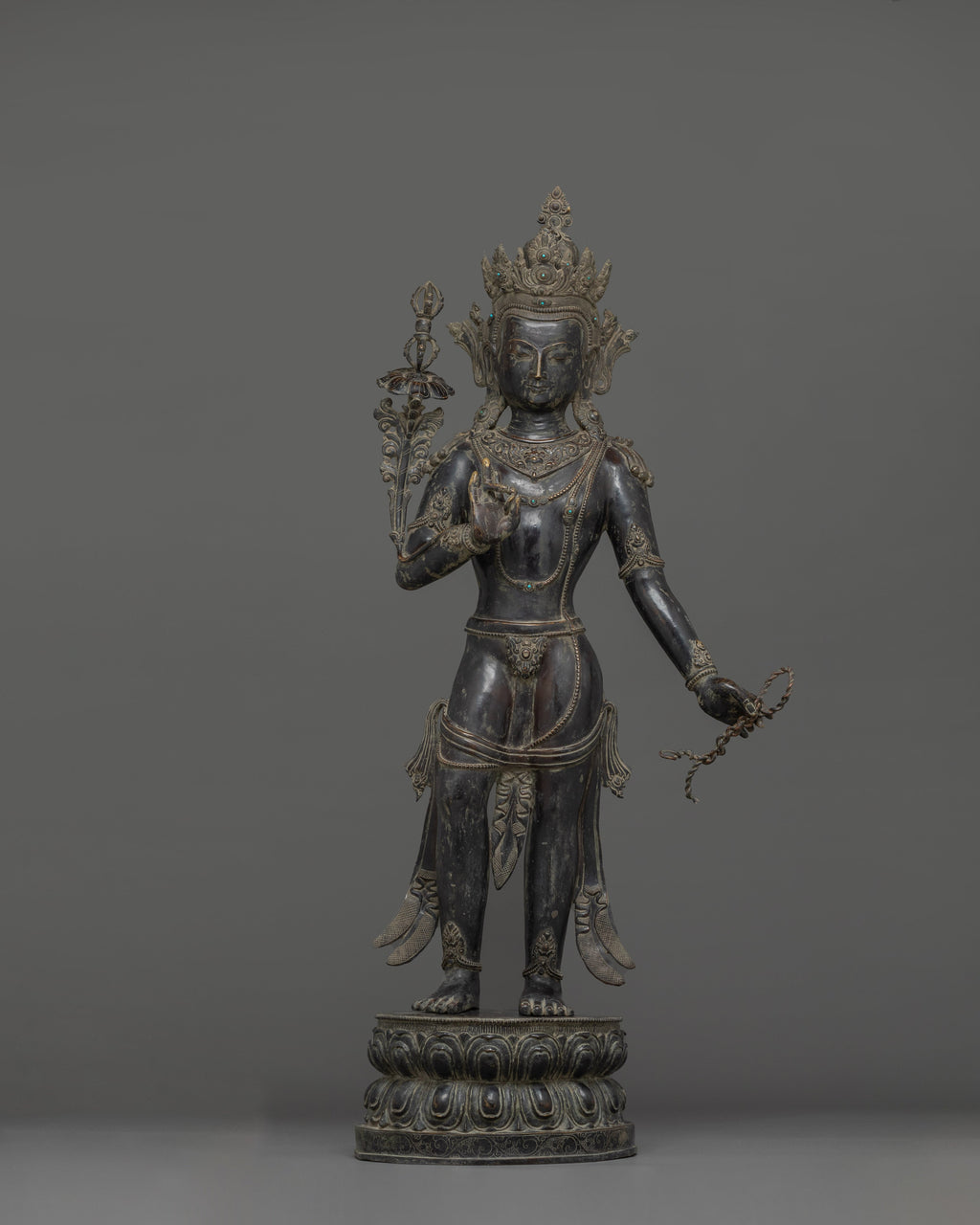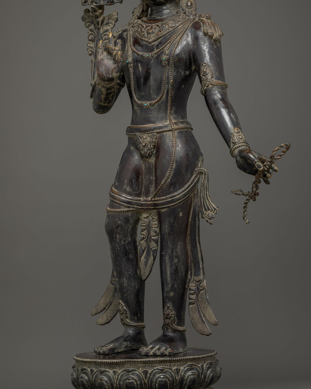 This Oxidized Copper Standing Vajrapani Statue represents the embodiment of spiritual strength and protection within Buddhist tradition. Standing majestically at 101.5 cm, this striking figure portrays Vajrapani—the Protector of the Buddha and the manifestation of all enlightened power. His fierce expression, dynamic posture, and powerful stance signify the conquering of ignorance and fear, reminding practitioners of the unwavering strength of wisdom. Crafted from an oxidized copper body, the statue exudes an ancient, dignified presence that enriches any altar, monastery, or meditation space.