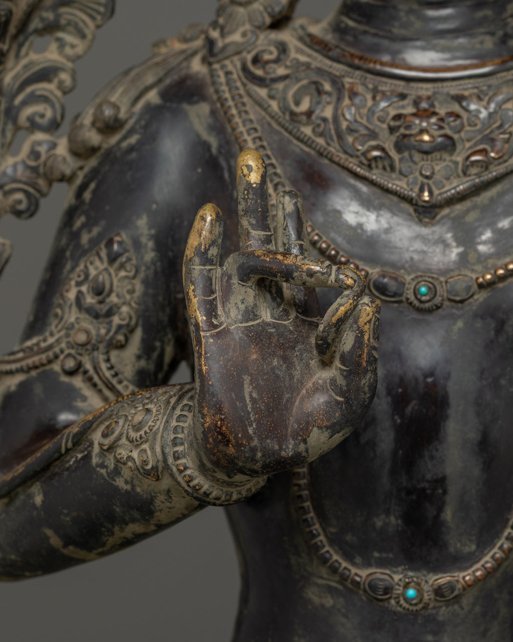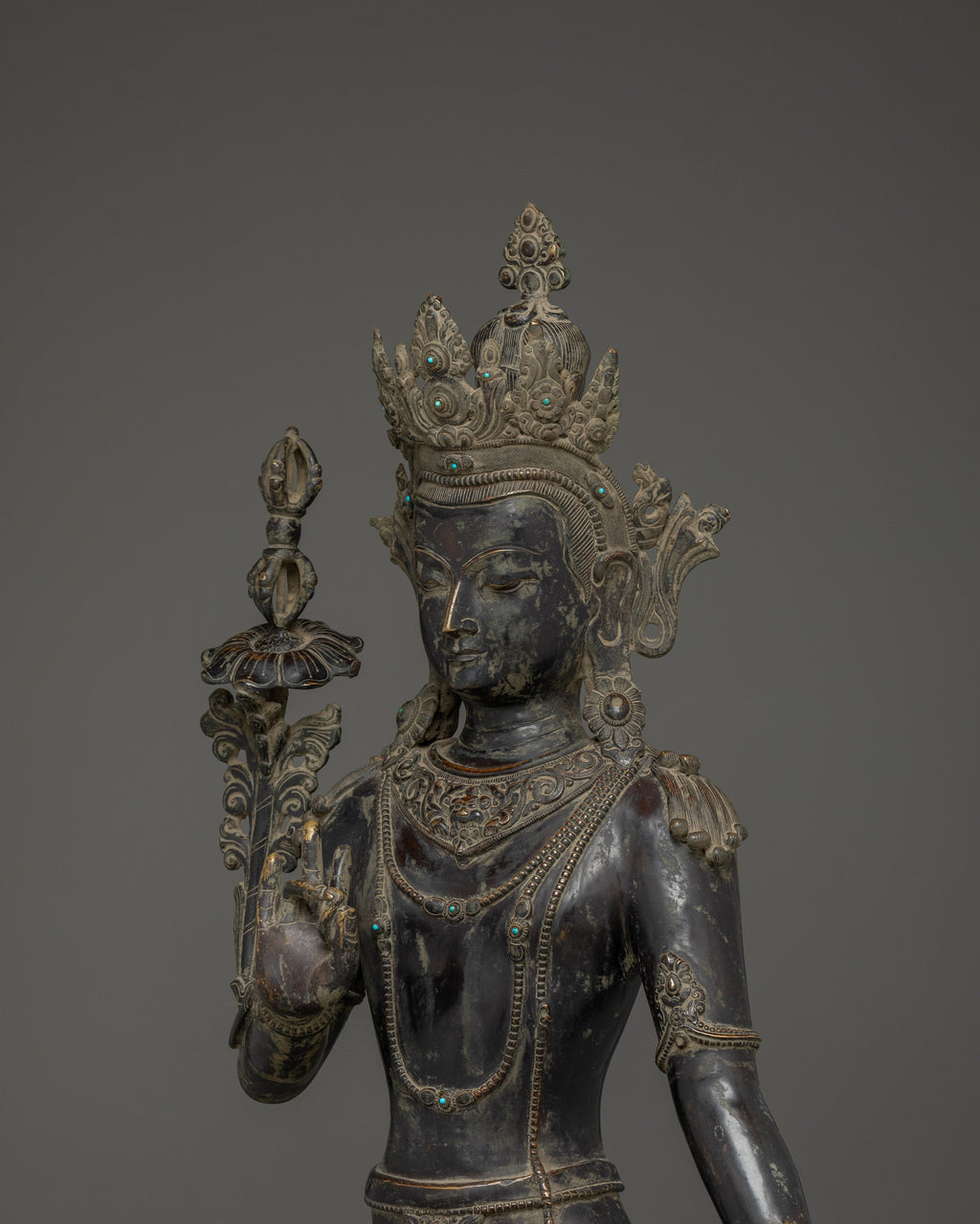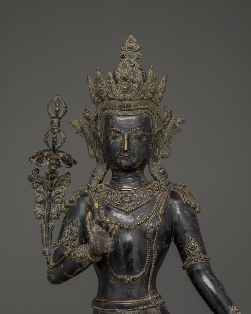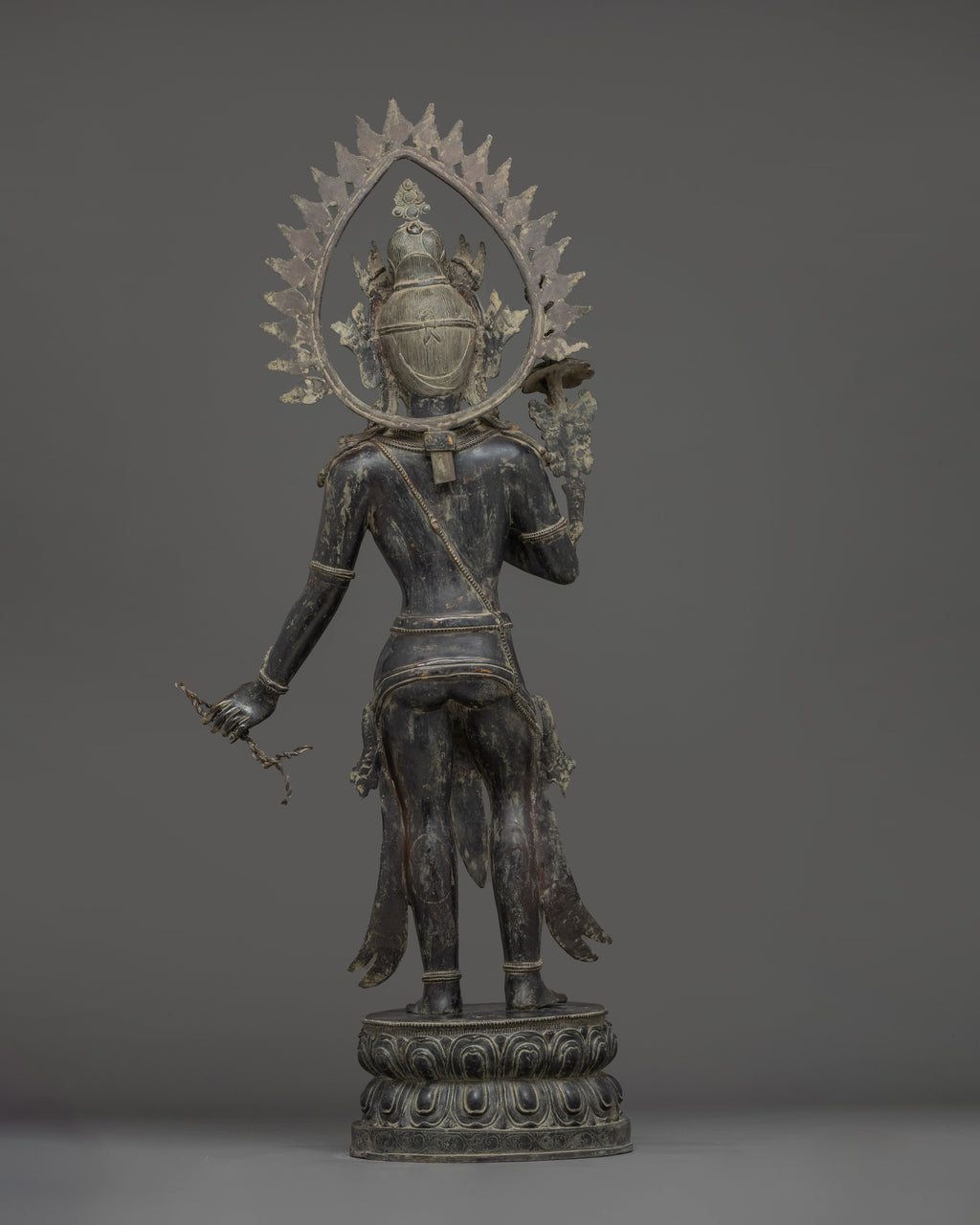 This Oxidized Copper Standing Vajrapani Statue represents the embodiment of spiritual strength and protection within Buddhist tradition. Standing majestically at 101.5 cm, this striking figure portrays Vajrapani—the Protector of the Buddha and the manifestation of all enlightened power. His fierce expression, dynamic posture, and powerful stance signify the conquering of ignorance and fear, reminding practitioners of the unwavering strength of wisdom. Crafted from an oxidized copper body, the statue exudes an ancient, dignified presence that enriches any altar, monastery, or meditation space.