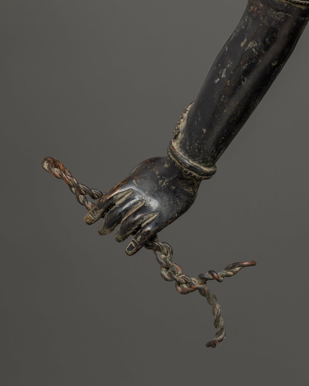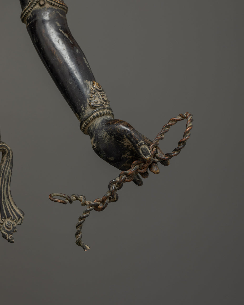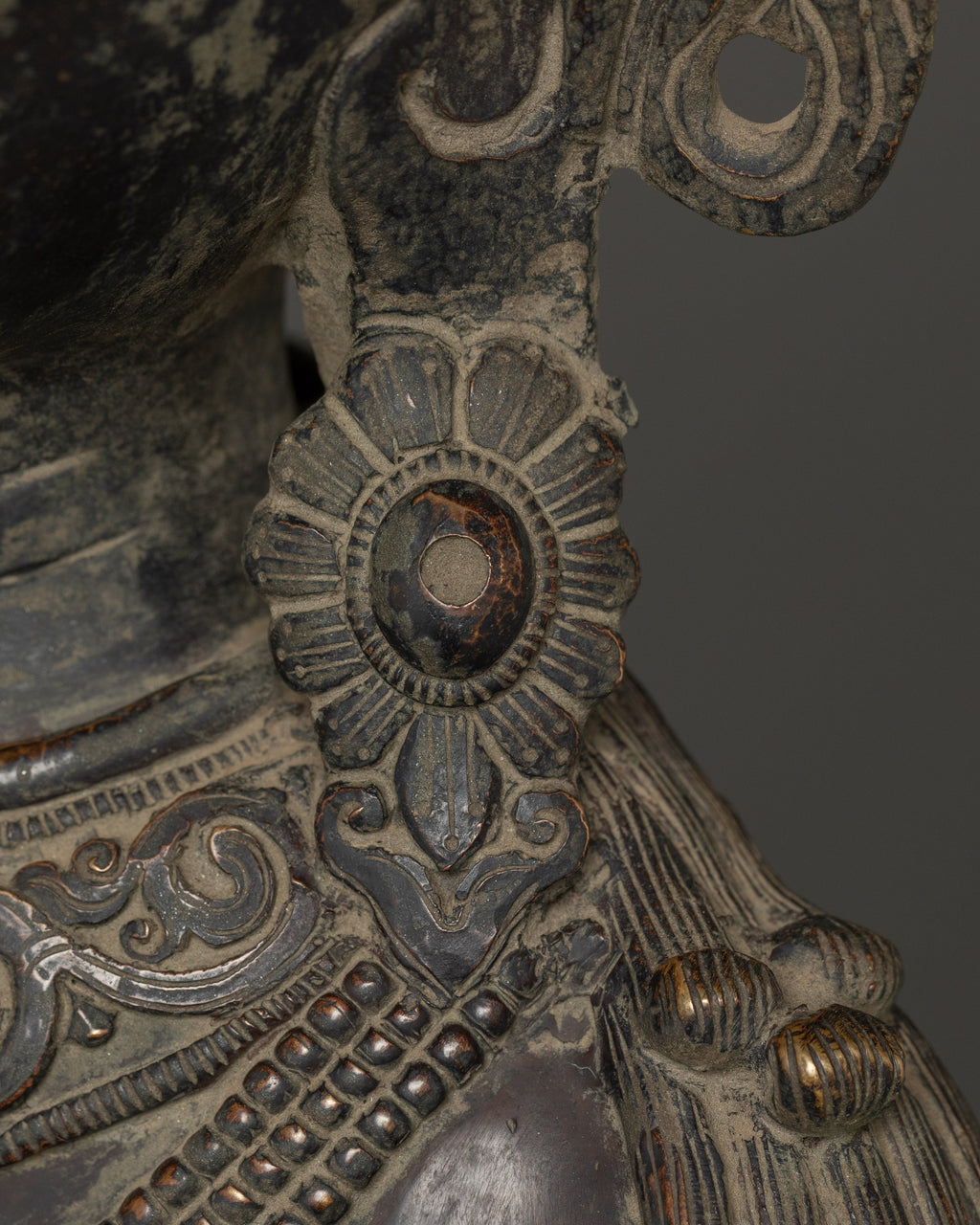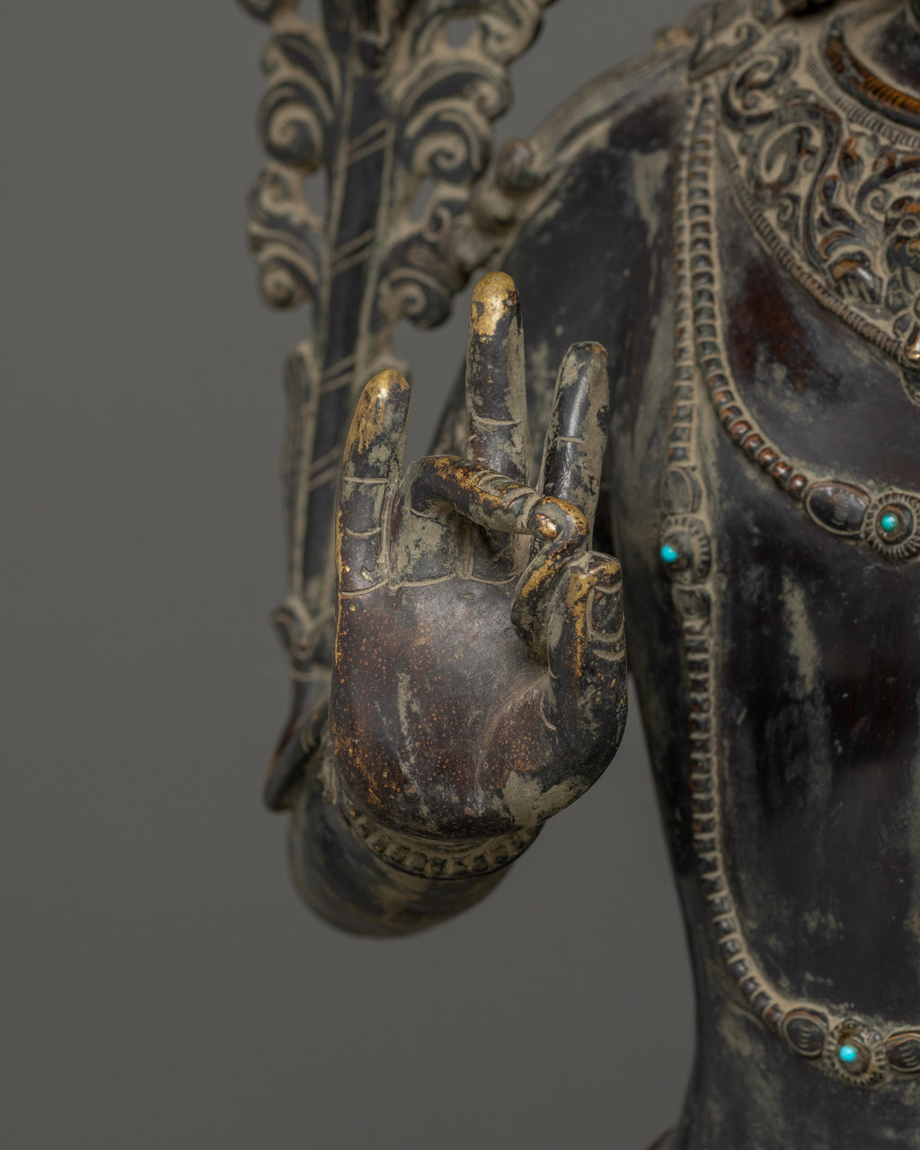 This Oxidized Copper Standing Vajrapani Statue represents the embodiment of spiritual strength and protection within Buddhist tradition. Standing majestically at 101.5 cm, this striking figure portrays Vajrapani—the Protector of the Buddha and the manifestation of all enlightened power. His fierce expression, dynamic posture, and powerful stance signify the conquering of ignorance and fear, reminding practitioners of the unwavering strength of wisdom. Crafted from an oxidized copper body, the statue exudes an ancient, dignified presence that enriches any altar, monastery, or meditation space.