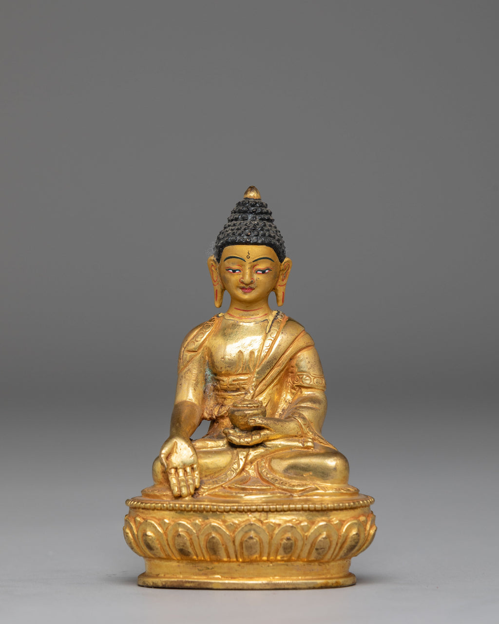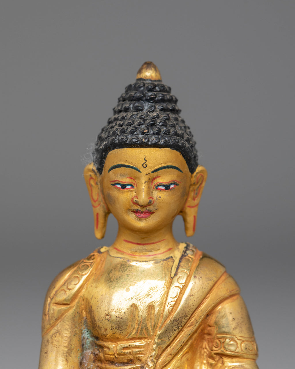 The statue showcases Ratnasabhava Buddha seated in a meditative posture, symbolizing the Buddha's deep wisdom and his capacity to grant prosperity to those who seek spiritual growth. His right hand is held in a gesture of generosity, holding the jewel of spiritual wealth, while his left hand is resting in his lap, symbolizing a state of peace and contemplation. The intricate detailing, from the flowing robes to the lotus base, represents the purity and unbroken cycle of wisdom, wealth, and enlightenment. The gold plating adds a radiant glow, highlighting the divine nature of Ratnasabhava and making it an eye-catching centerpiece for any altar.