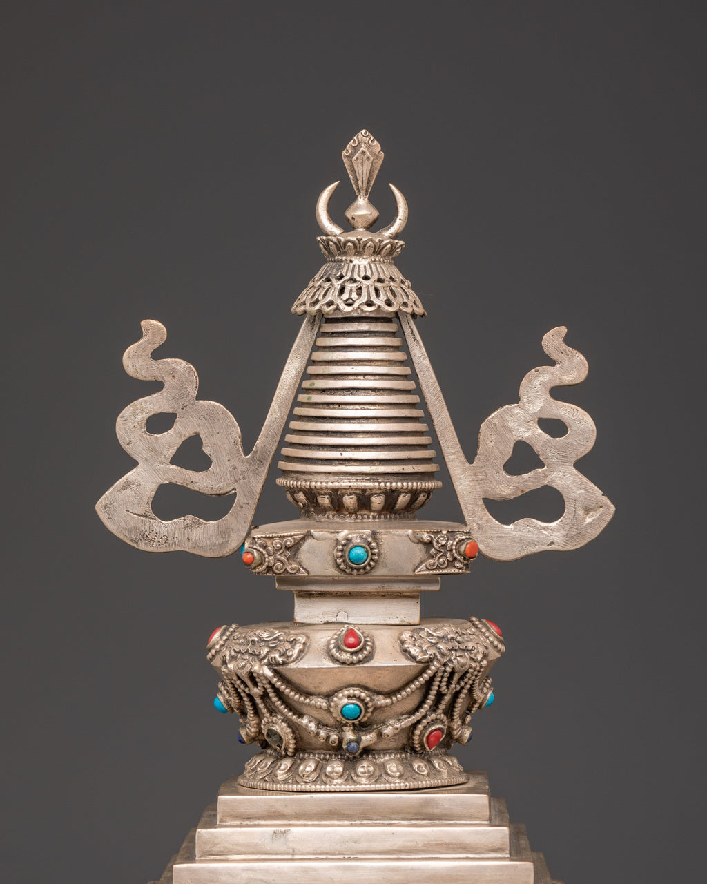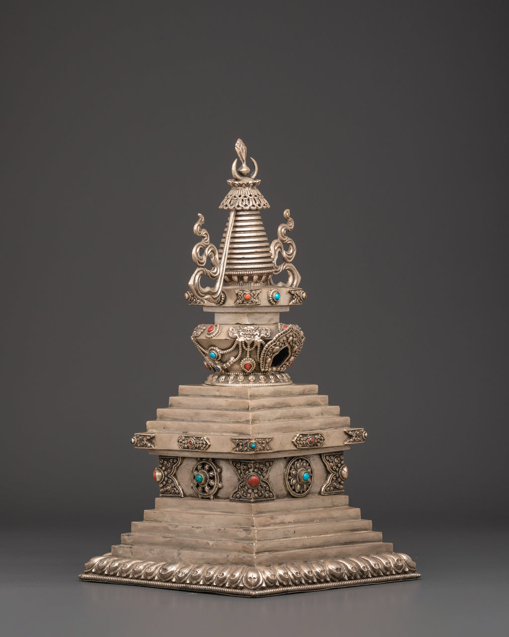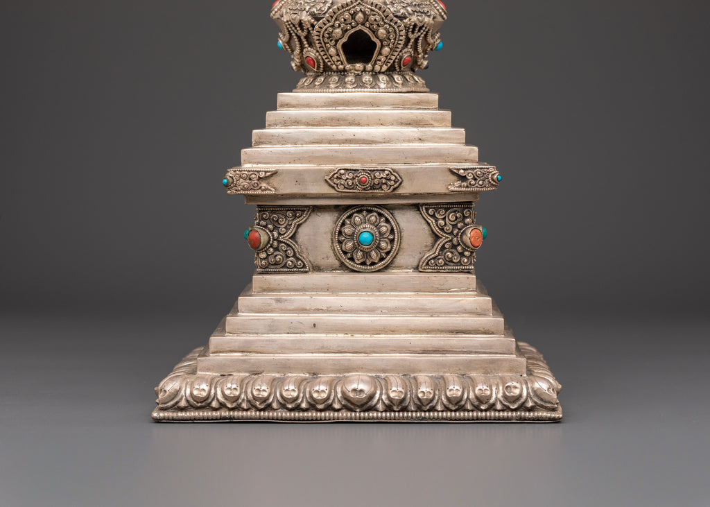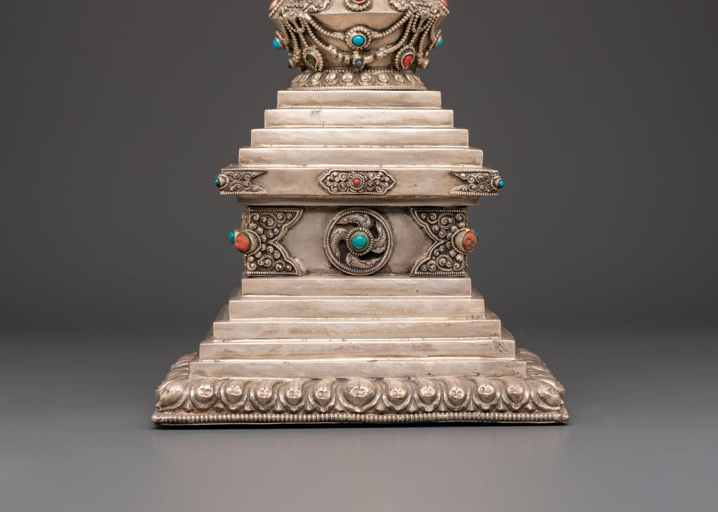 Handmade Copper Stupa with Silver Plating | Tibetan Buddhist Sculpture