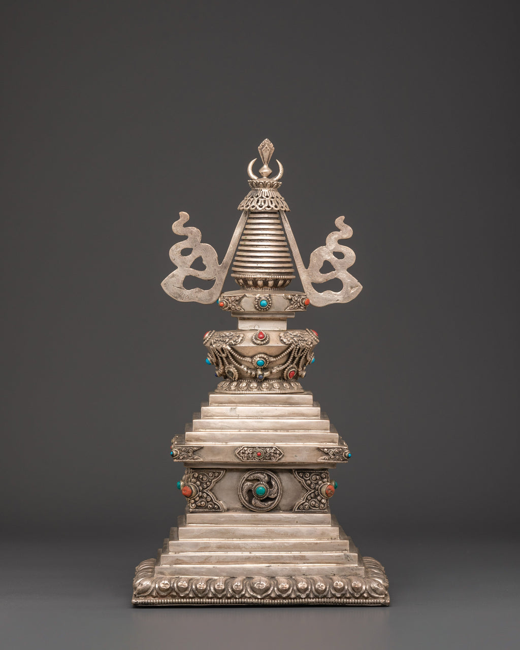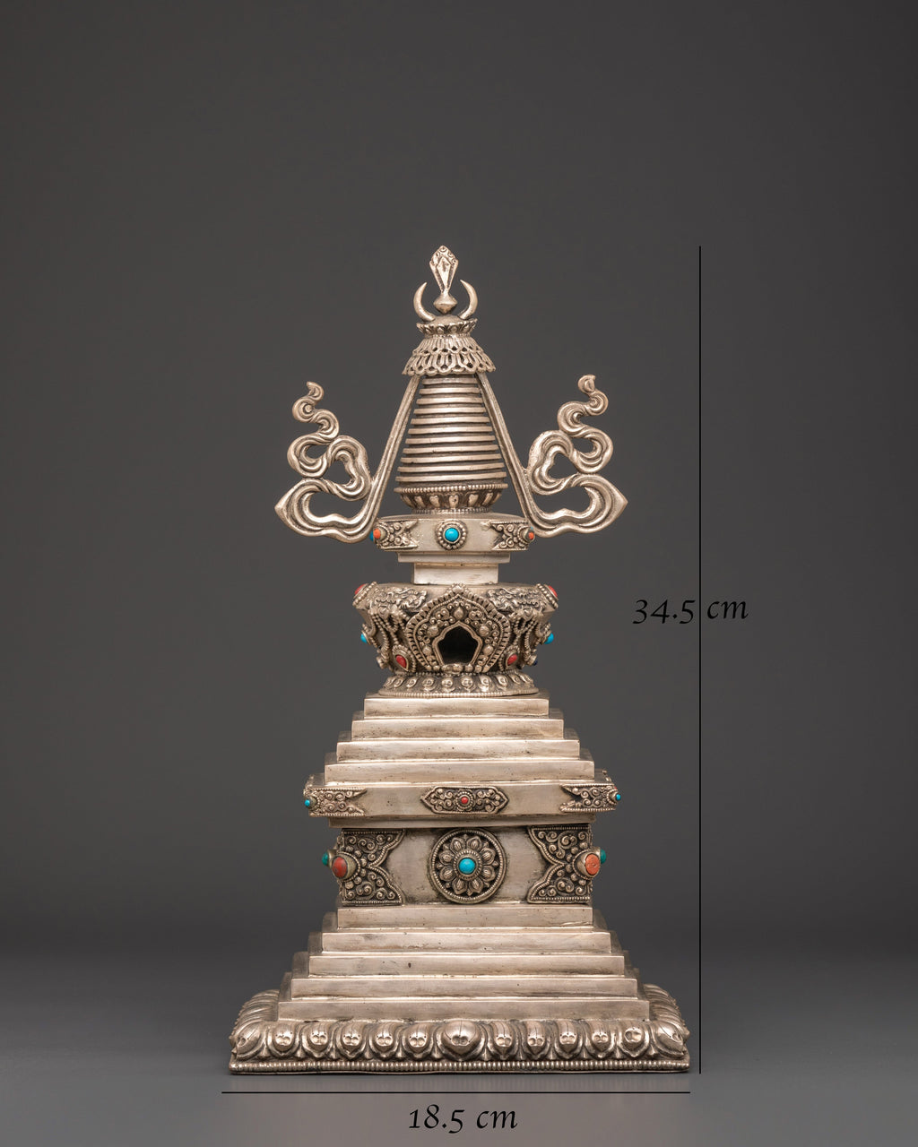 Elevate your spiritual space with this beautifully crafted, handmade copper stupa featuring silver plating. Standing at 34.5cm in height, this piece is not only a work of art but also a symbol of tranquility and wisdom. The stupa, a sacred Buddhist monument, is intricately designed with inlays of Coral and Turquoise, reflecting the rich cultural and spiritual heritage of Tibetan traditions. Its combination of copper and silver plating offers a stunning visual contrast, making it a perfect focal point for meditation rooms, altars, or any spiritual setting.