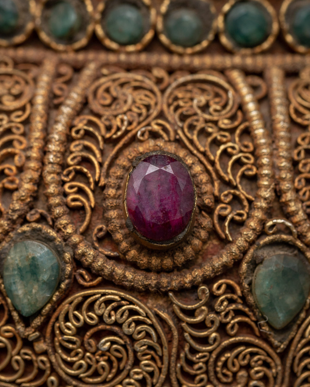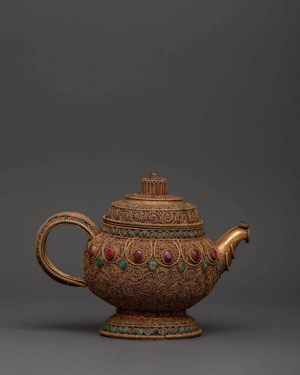 The handcrafted design features expert craftsmanship and beautiful filigree designs representing protection and heavenly energy. The arrangement of symbolic stones, such as turquoise for healing, coral for vitality, and lapis for spiritual insight, elevates this teapot above its function as a vessel, making it a symbol of harmony, prosperity, and spiritual enlightenment.