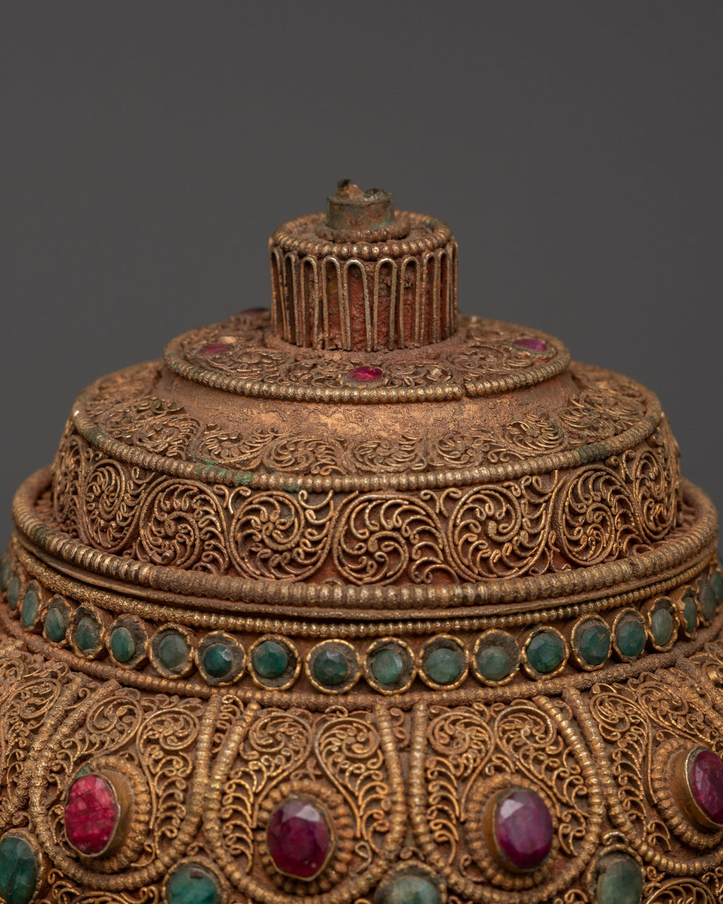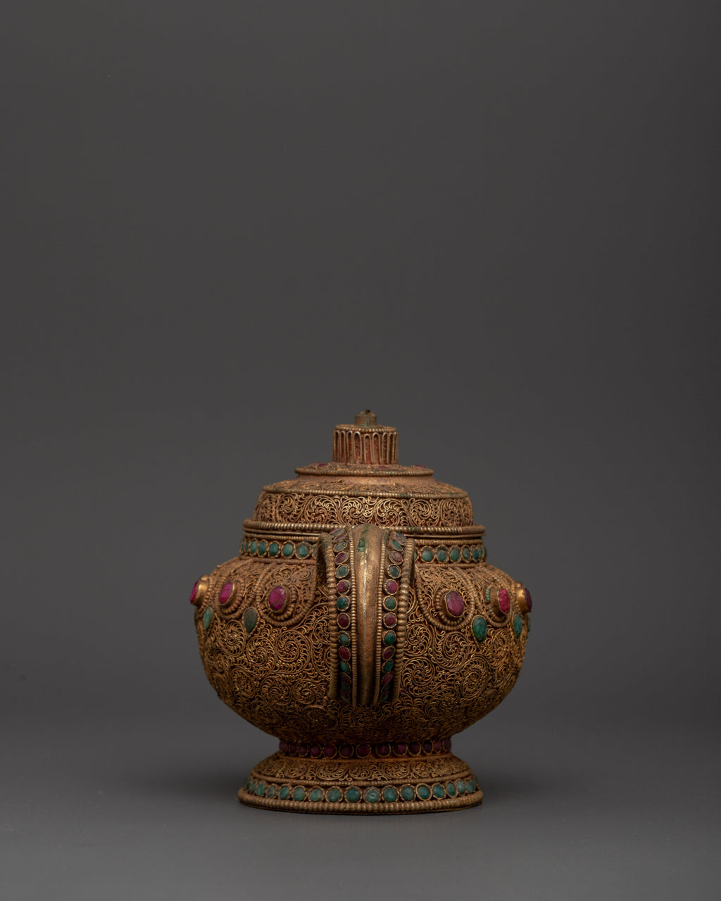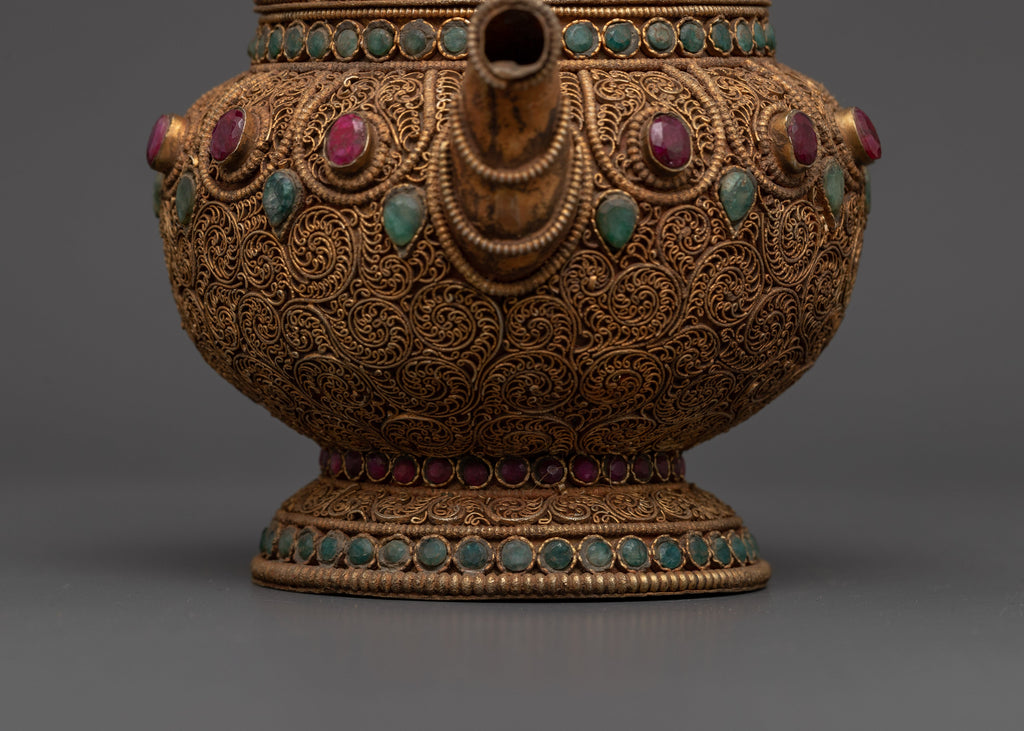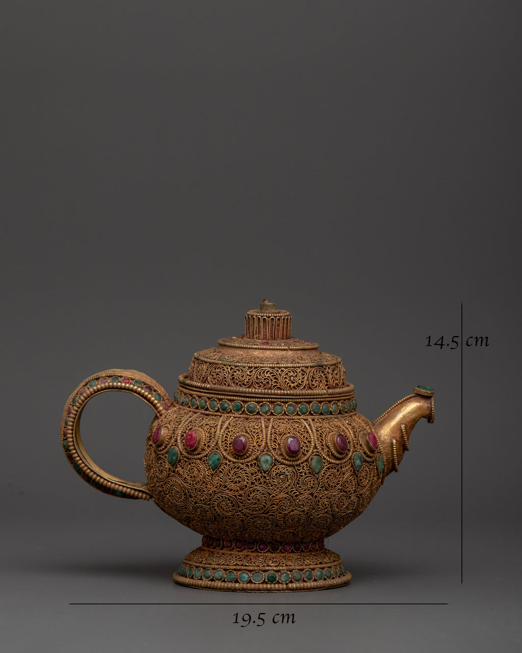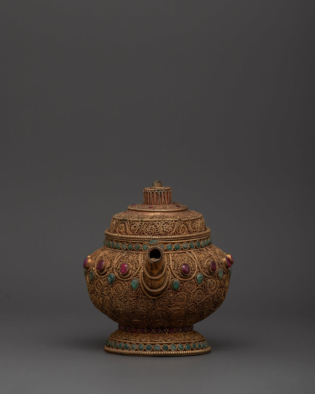 This Tibetan Teapot is a magnificent example of workmanship and symbolism. It has careful filigree work on a copper body accented by electro gold and silver plating. It stands 14.5 cm tall and 19.5 cm wide, weighs 0.62 kg, and is embellished with artificial stones such as turquoise, lapis lazuli, and coral. This teapot, which has traditionally been used in religious rites, also makes an eye-catching display piece for spiritual spaces.