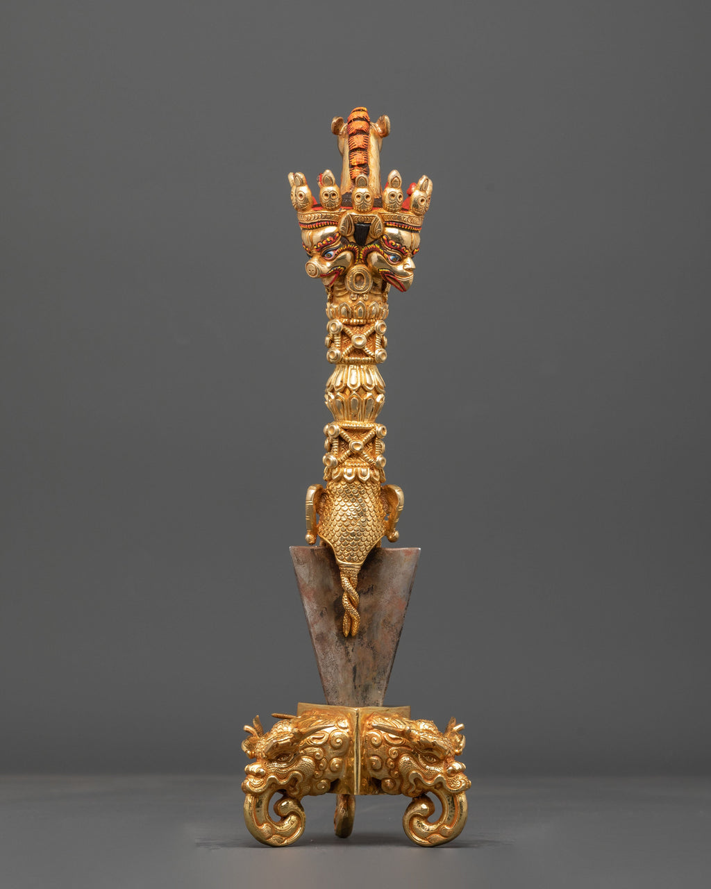 The intricate design showcases a three-sided blade, representing the transformation of the three poisons—ignorance, attachment, and aversion—into enlightened awareness. The upper section features finely detailed faces of wrathful deities, embodying the protective energy of the enlightened mind. The combination of gold-plated copper and solid iron gives this Phurba both aesthetic brilliance and ritual authenticity, making it suitable for both practitioners and collectors of sacred Himalayan art.